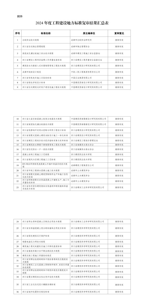 附件2024年度工程建设地方标准复审结果汇总表序号标准名称原主编单位复审意见1白蚁防治技术规程成都市白蚁防治研究所继续有效2四川省住宅物业管理规程成都市物业管理协会继续有效3旋挖成孔灌注桩施工安全技术规程成都市建设工程施工安全监督站继续有效4四川省建设工程项目监理工作质量检查标准四川省建设工程质量安全监督总站继续有效5建筑给水内筋嵌入式衬塑钢管管道工程技术规程四川省建筑设计研究院有限公司继续有效6成都市地铁设计规范中铁二院工程集团有限责任公司继续有效7四川省有轨电车施工及验收标准中国五冶集团有限公司继续有效8四川省绿色学校设计标准中国建筑西南设计研究院有限公司继续有效9四川省住宅建筑光纤到户通信设施工程技术规程中国建筑西南设计研究院有限公司继续有效
