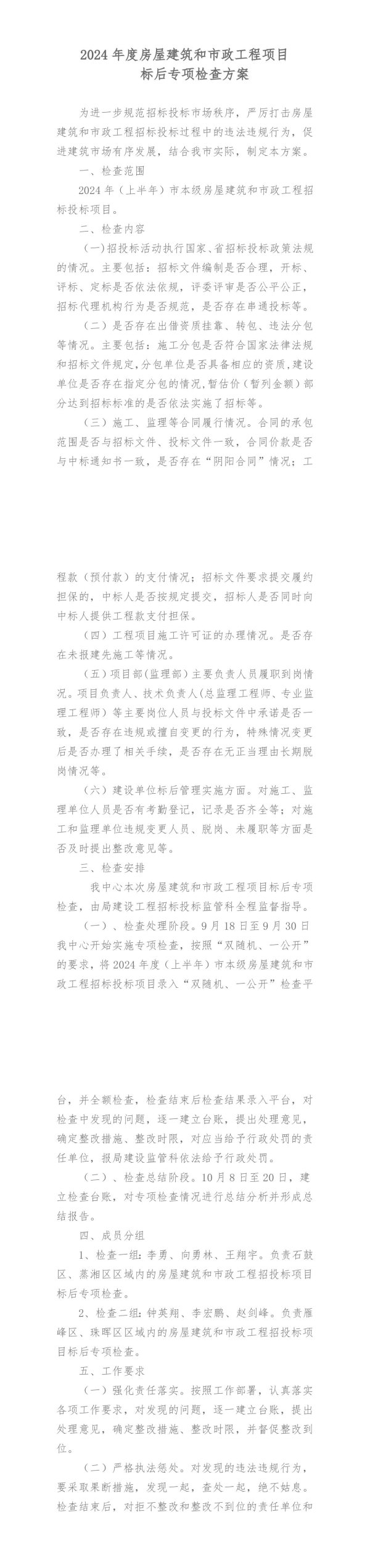 1、检查一组:李勇、向勇林、王翔宇。负责石鼓区、蒸湘区区域内的房屋建筑和市政工程招投标项目标后专项检查。