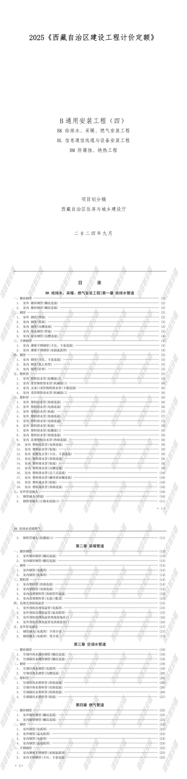 2025《西藏自治区建设工程计价定额》B通用安装工程(四)BK给排水、采暖、燃气安装工程BL信息通信线缆与设备安装工程BM防腐蚀、绝热工程项目划分稿西藏自治区住房与城乡建设厅二0二四年九月
