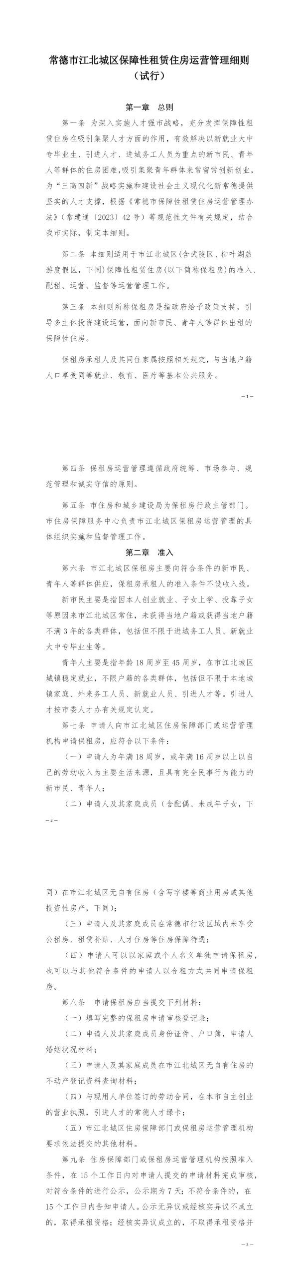 第二条本细则适用于市江北城区(含武陵区、柳叶湖旅游度假区,下同)保障性租赁住房(以下简称保租房)的准入、配租、运营、监督等运营管理工作。