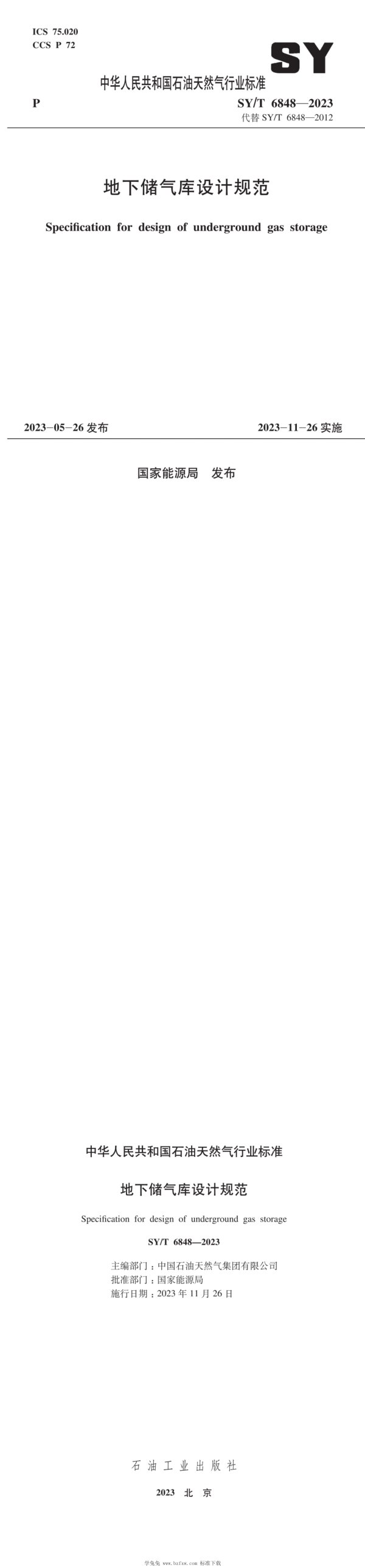 ICS75.020CCSP72SY中华人民共和国石油天然气行业标准PSY/T6848—2023代替SY/T6848—2012地下储气库设计规范Specificationfordesignofundergroundgasstorage2023-05-26发布2023-11-26实施2023-05-26发布2023-11-26买施国家能源局发布