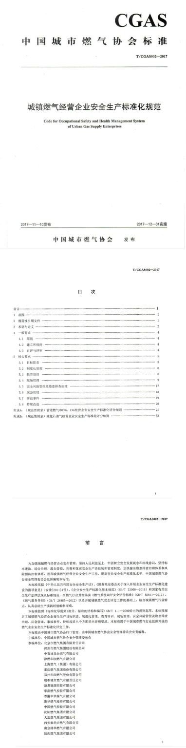 CGAS中国城市燃气协会标准T/CGAS002-2017城镇燃气经营企业安全生产标准化规范CodeforOccupationalSafetyandHealthManagementSystemofUrbanGasSupplyEnterprises2017-11-10发布2017-12-01实施中国城市燃气协会发布