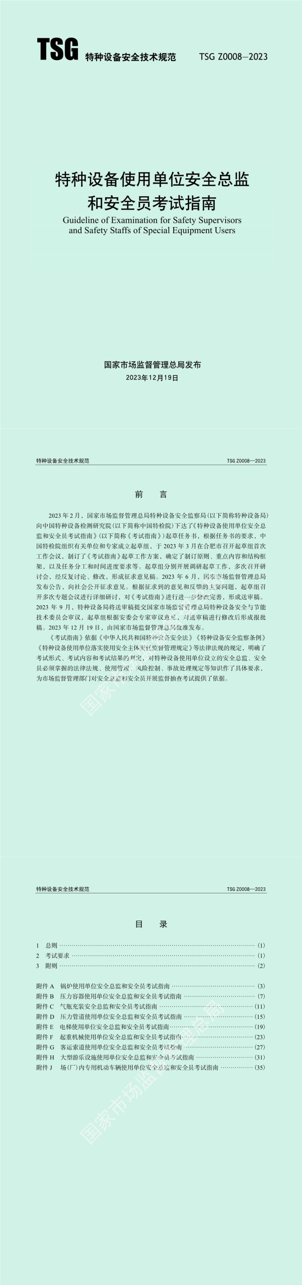 特种设备安全技术规范TSGZ0008—2023前言2023年2月,国家市场监督管理总局特种设备安全监察局(以下简称特种设备局)向中国特种设备检测研究院(以下简称中国特检院)下达了《特种设备使用单位安全总监和安全员考试指南》(以下简称《考试指南》)起草任务书,根据任务书的要求,中国特检院组织有关单位和专家成立起草组,于2023年3月在合肥市召开起草组首次工作会议,制订了《考试指南》起草工作方案,确定了制订原则、重点内容和结构框架,以及任务分工和时间进度要求等。起草组分别开展调研起草工作,多次召开研讨会,经反复讨论、修改,形成征求意见稿。2023年6月,国家市场监督管理总局发布公告,向社会公开征求意见。根据征求到的意见和反馈的主要问题,起草组召开多次专题会议进行详细研讨,对《考试指南》进行进一步修改完善,形成送审稿。2023年9月,特种设备局将送审稿提交国家市场监督管理总局特种设备安全与节能技术委员会审议,起草组根据安委会专家审议意见,对送审稿进行修改后形成报批稿。2023年12月19日,由国家市场监督管理总局批准发布。《考试指南》依据《中华人民共和国特种设备安全法》《特种设备安全监察条例》《特种设备使用单位落实使用安全主体责任监督管理规定》等法律法规的规定,明确了考试形式、考试内容和考试结果的判定,对特种设备使用单位设立的安全总监、安全员必须掌握的法律法规、使用管理,风险控制、事故处理规定等知识作了具体要求,为市场监督管理部门对安全总监和安全员开展监督抽查考试提供了依据。国家
