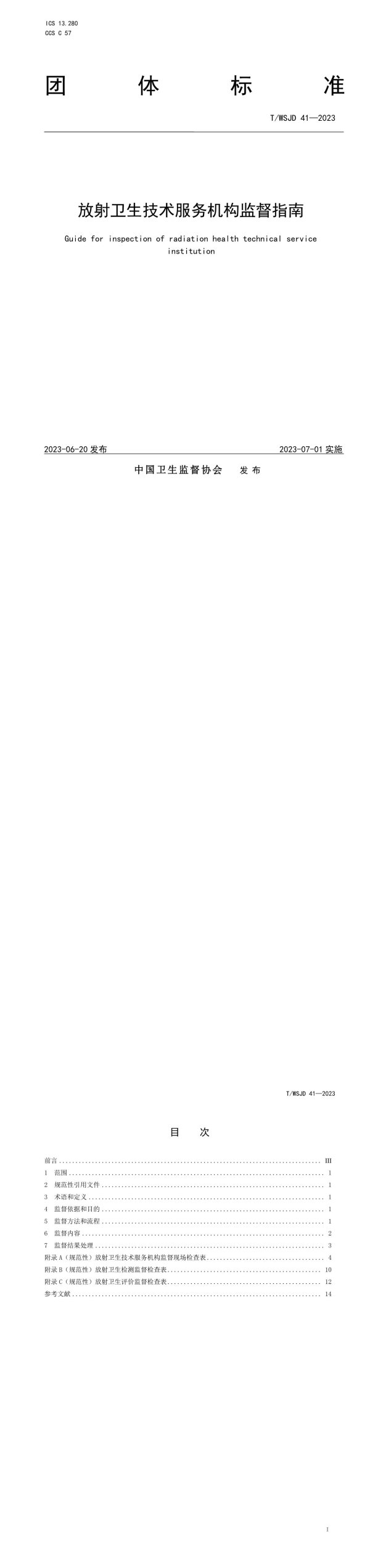 ICS13.280CCSC57团体标准T/WSJD41—2023放射卫生技术服务机构监督指南Guideforinspectionofradiationhealthtechnicalserviceinstitution2023-06-20发布2023-07-01实施中国卫生监督协会发布