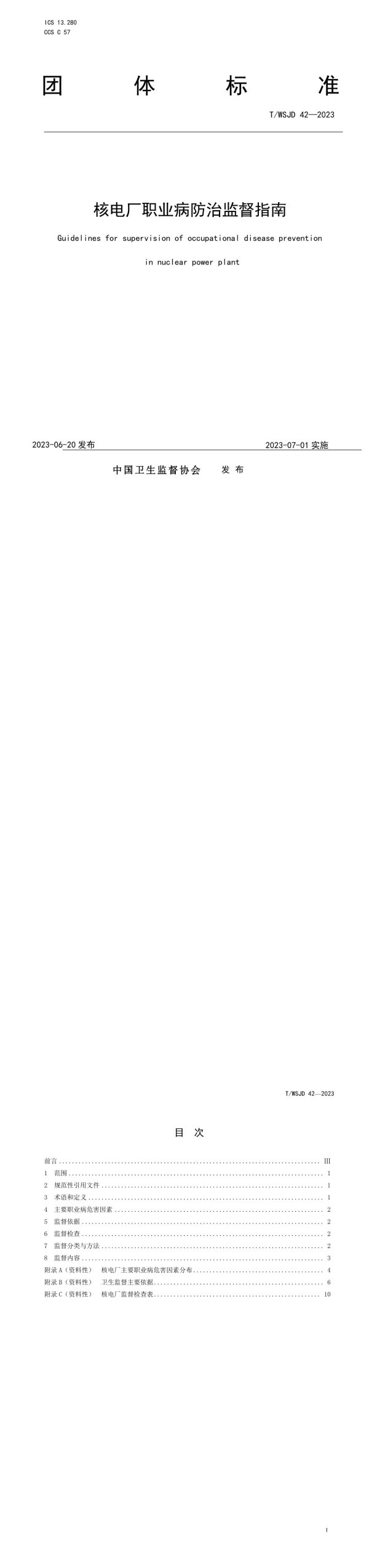 ICS13.280CCSC57团体标准T/WSJD42—2023核电厂职业病防治监督指南Guidelinesforsupervisionofoccupationaldiseasepreventioninnuclearpowerplant2023-06-20发布2023-07-01实施中国卫生监督协会发布