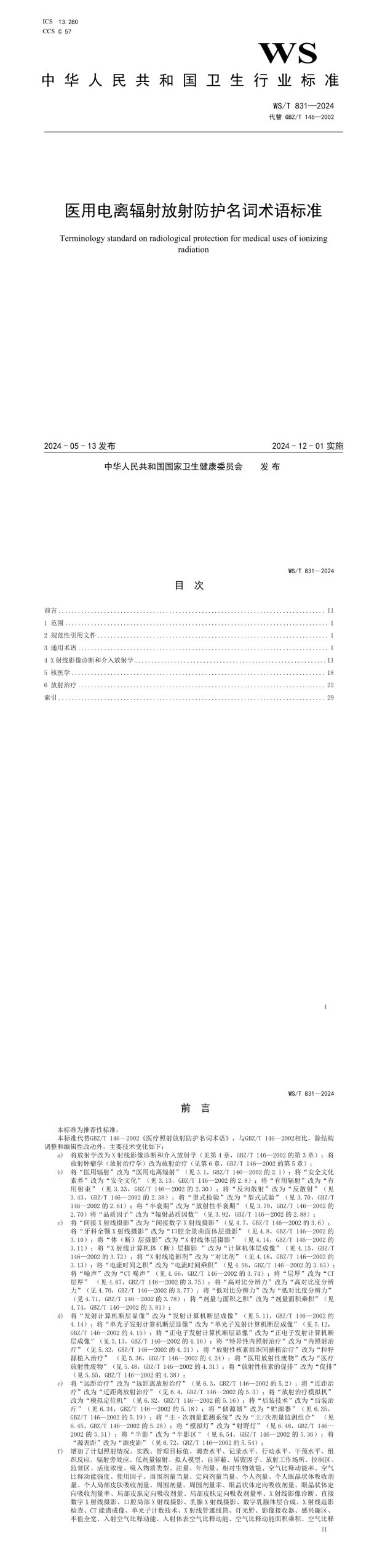 WS/T831—2024前言本标准为推荐性标准。本标准代替GBZ/T1462002《医疗照射放射防护名词术语》,与GBZ/T1462002相比,除结构调整和编辑性改动外,主要技术变化如下:a)将放射学改为X射线影像诊断和介入放射学(见第4章,GBZ/T1462002的第3章);将放射肿瘤学(放射治疗学)改为放射治疗(见第6章,GBZ/T146—2002的第5章)b)将“医用辐射”改为“医用电离辐射”(见3.1,GBZ/T1462002的2.1);将“安全文化素养”改为“安全文化”(见3.13,GBZ/T1462002的2.8);将“有用辐射”改为“有用射束”(见3.33,GBZ/T1462002的2.30);将“反向散射”改为“反散射”(见3.43,GBZ/T1462002的2.38):将“型式检验”改为“型式试验”(见3.70,GBZ/T1462002的2.61);将“半衰期”改为“放射性半衰期”(见3.79,GBZ/T1462002的2.70)将“品质因子”改为“辐射品质因数”(见3.92,GBZ/T146一2002的2.88);c)将“间接X射线摄影”改为“间接数字X射线摄影”(见4.7,GBZ/T1462002的3.6);将“科全颚X射线摄影”改为“口腔全景曲面体层摄影”(见4.8,GBZ/T1462002的3.10);将“体(断)层摄影”改为“X射线体层摄影”(见4.14,GBZ/T146—2002的3.11);将“X射线计算机体(断)层摄影”改为“计算机体层成像”(见4.15,GBZ/T146—2002的3.72);将“X射线造影剂”改为“对比剂”(见4.18,GBZ/T146—2002的3.13);