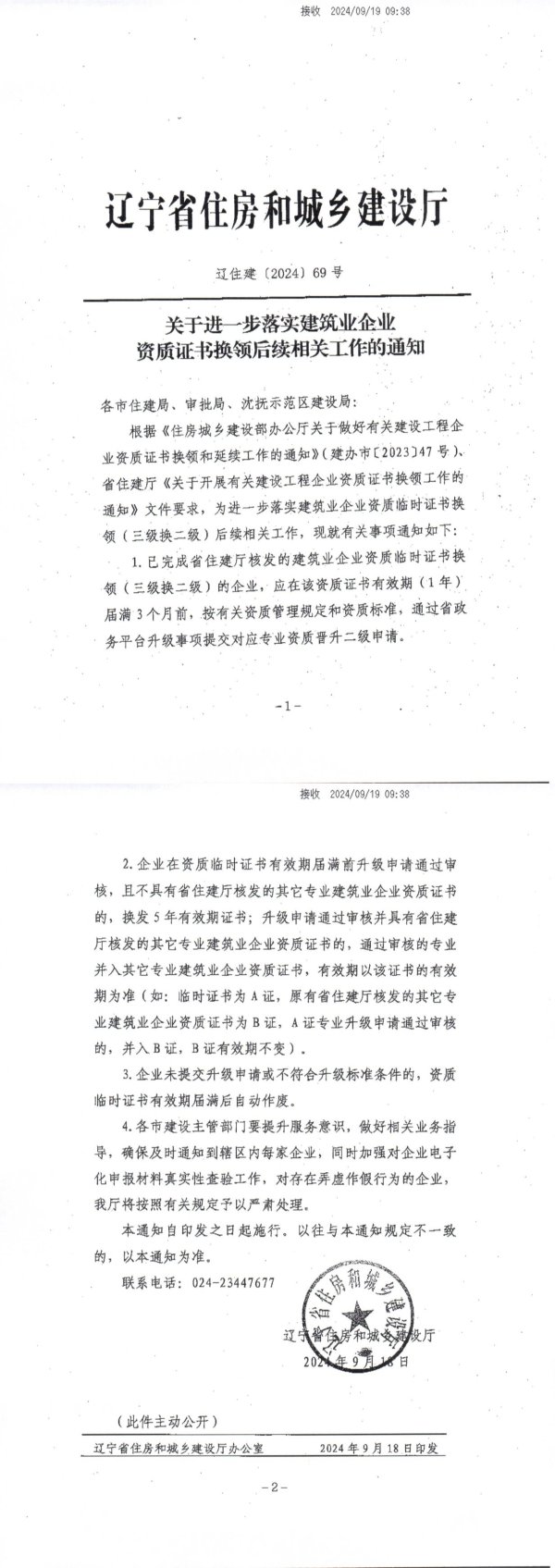 接收2024/09/1909:38辽宁省住房和城乡建设厅辽住建(2024)69号关于进一步落实建筑业企业资质证书换领后续相关工作的通知各市住建局、审批局、沈抚示范区建设局:根据《住房城乡建设部办公厅关于做好有关建设工程企业资质证书换领和延续工作的通知》(建办市[2023]47号)、省住建厅《关于开展有关建设工程企业资质证书换领工作的通知》文件要求,为进一步落实建筑业企业资质临时证书换领(三级换二级)后续相关工作,现就有关事项通知如下:1.已完成省住建厅核发的建筑业企业资质临时证书换领(三级换二级)的企业,应在该资质证书有效期(1年)届满3个月前,按有关资质管理规定和资质标准,通过省政务平台升级事项提交对应专业资质晋升二级申请。-1-