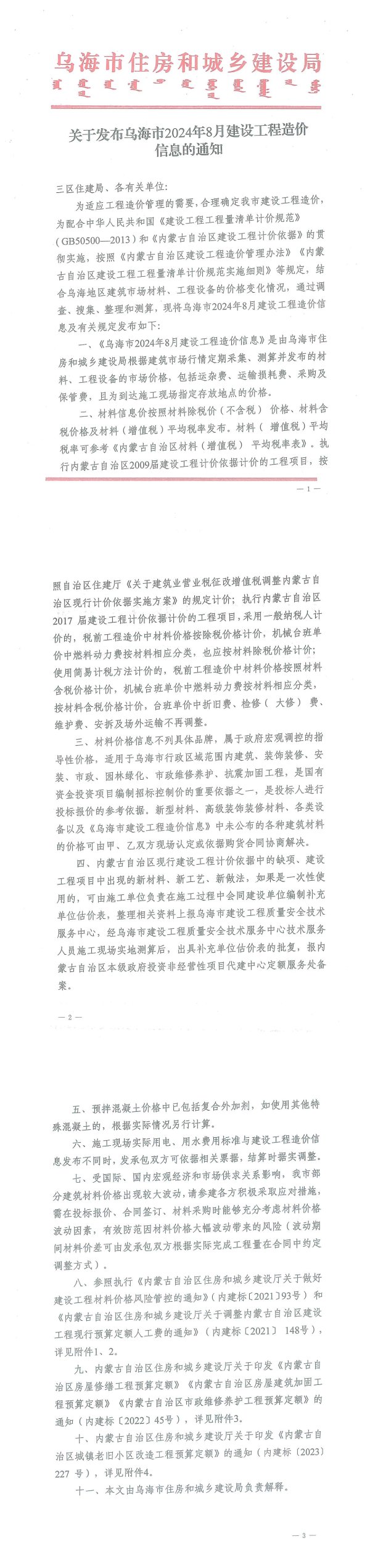乌海市住房和城乡建设局真星建道一這臺畫畫工三富关于发布乌海市2024年8月建设工程造价信息的通知三区住建局、各有关单位:为适应工程造价管理的需要,合理确定我市建设工程造价,为配合中华人民共和国《建设工程工程量清单计价规范》(GB50500——2013)和《内蒙古自治区建设工程计价依据》的贯彻实施,按照《内蒙古自治区建设工程造价管理办法》《内蒙古自治区建设工程工程量清单计价规范实施细则》等规定,结合鸟海地区建筑市场材料、工程设备的价格变化情况,通过调查、搜集、整理和测算,现将乌海市2024年8月建设工程造价信息及有关规定发布如下:一、《乌海市2024年8月建设工程造价信息》是由乌海市住房和城乡建设局根据建筑市场行情定期采集、测算并发布的材料、工程设备的市场价格,包括运杂费、运输损耗费、采购及保管费,且为到达施工现场指定存放地点的价格。二、材料信息价按照材料除税价(不含税)价格、材料含税价格及材料(增值税)平均税率发布。材料(增值税)平均税率可参考《内蒙古自治区材料(增值税)平均税率表》。执行内蒙古自治区2009届建设工程计价依据计价的工程项目,按