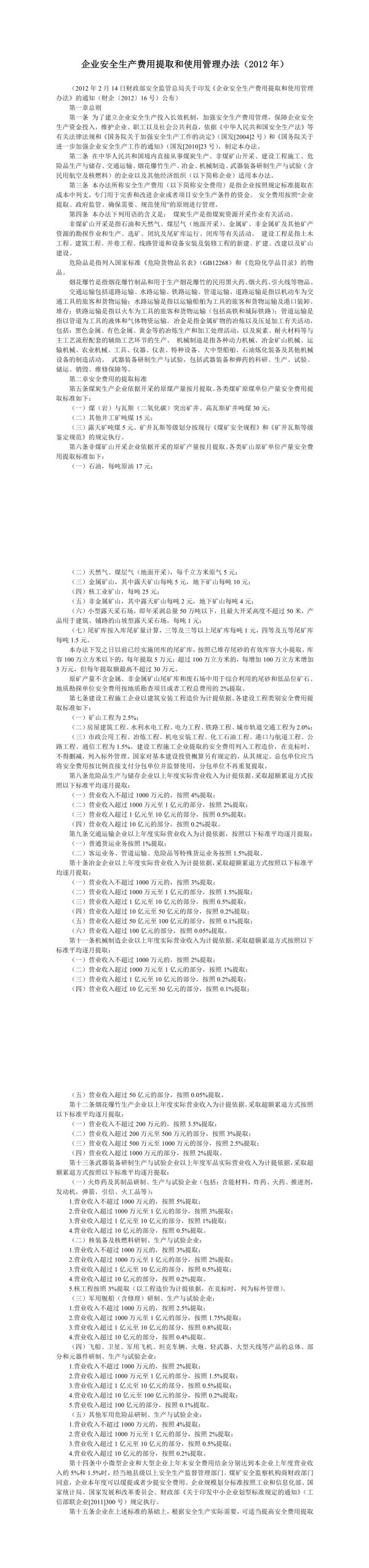 企业安全生产费用提取和使用管理办法(2012年)(2012年2月14日财政部安全监管总局关于印发《企业安全生产费用提取和使用管理办法》的通知(财企〔2012)16号)公布)第一章总则第一条为了建立企业安全生产投入长效机制,加强安全生产费用管理,保障企业安全生产资金投入,维护企业、职工以及社会公共利益,依据《中华人民共和国安全生产法》等有关法律法规和《国务院关于加强安全生产工作的决定》(国发[2004]2号)和《国务院关于进一步加强企业安全生产工作的通知》(国发[2010]23号),制定本办法。第二条在中华人民共和国境内直接从事煤炭生产、非煤矿山开采、建设工程施工、危险品生产与储存、交通运输、烟花爆生产、冶金、机械制造、武器装备研制生产与试验(含民用航空及核燃料)的企业以及其他经济组织(以下简称企业)适用本办法。第三条本办法所称安全生产费用(以下简称安全费用)是指企业按照规定标准提取在成本中列支,专门用于完善和改进企业或者项目安全生产条件的资金。安全费用按照“企业提取、政府监管、确保需要、规范使用的原则进行管理。第四条本办法下列用语的含义是:煤炭生产是指煤炭资源开采作业有关活动。非煤矿山开采是指石油和天然气、煤层气(地面开采)、金属矿、非金属矿及其他矿产资源的勘探作业和生产、选矿、闭坑及尾矿库运行、闭库等有关活动。建设工程是指土木工程、建筑工程、并巷工程、线路管道和设备安装及装修工程的新建、扩建、改建以及矿山建设。危险品是指列入国家标准《危险货物品名表》(GB12268)和《危险化学品目录》的物品。烟花爆竹是指烟花爆竹制品和用于生产烟花爆竹的民用黑火药、烟火药、引火线等物品。交通运输包括道路运输、水路运输、铁路运输、管道运输。道路运输是指以机动车为交通工具的旅客和货物运输;水路运输是指以运输船舶为工具的旅客和货物运输及港口装卸、堆存;铁路运输是指以火车为工具的旅客和货物运输(包括高铁和城际铁路);管道运输是指以管道为工具的液体和气体物资运输。冶金是指金属矿物的冶炼以及压延加工有关活动,包括:黑色金属、有色金属、黄金等的治炼生产和加工处理活动,以及炭素、耐火材料等与主工艺流程配套的辅助工艺环节的生产。机械制造是指各种动力机械、治金矿山机械、运输机械、农业机械、工具、仪器、仪表、特种设备、大中型船舶、油炼化装备及其他机械设备的制造活动。武器装备研制生产与试验,包括武器装备