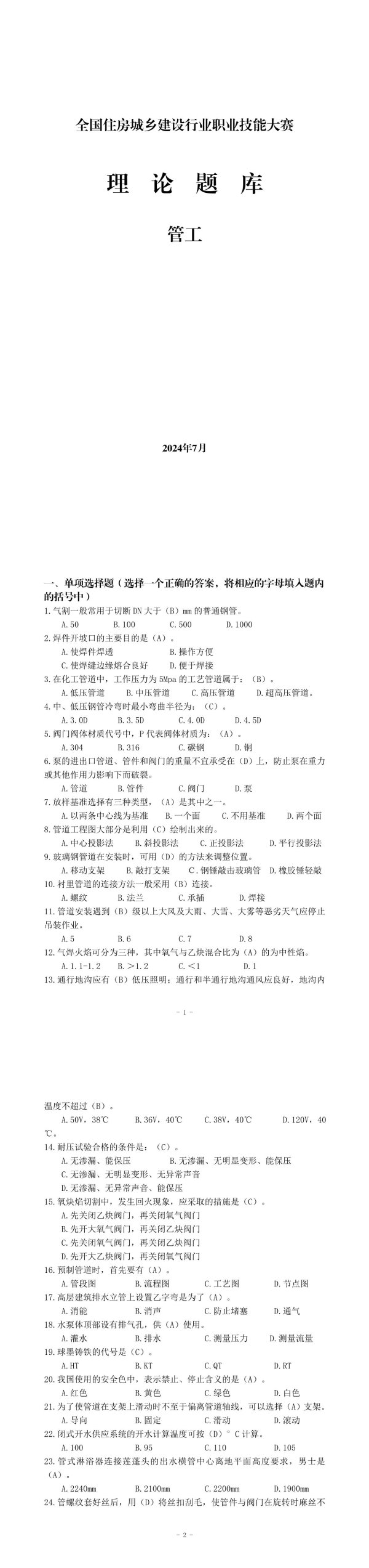 全国住房城乡建设行业职业技能大赛理论题库管工2024年7月