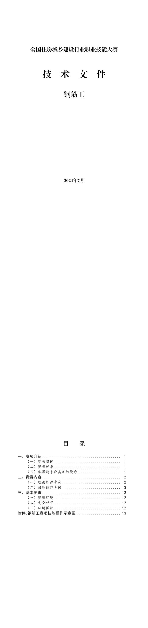 目录一、赛项介绍.1(一)赛项描述.1(二)赛项标准.1(三)参赛选手应具备的能力.1二、竞赛内容..2(一)理论知识考试.2(二)技能操作考核.3三、基本要求.12(一)赛场环境.12(二)安全教育.12(三)环境保护.12附件:钢筋工赛项技能操作示意图13