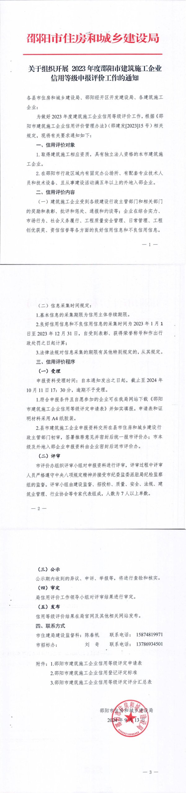 邵阳市住房和城乡建设局关于组织开展2023年度邵阳市建筑施工企业信用等级申报评价工作的通知各县市住房和城乡建设局、邵阳经开区开发建设局、各建筑施工企业:为做好2023年度建筑施工企业信用等级评价工作,根据《邵阳市建筑施工企业信用评价管理办法》(邵建发[2023115号)相关规定,现将有关要求通知如下:一、信用评价对象1.取得建筑施工相应资质,具有独立法人资格的本市建筑施工企业。2.在邵阳市行政区域内有固定办公场所、有配套专业技术人员和技术设备、且从事建设活动满五年以上的外地入邵企业。二、信用评价内容(一)建筑施工企业受到各级建设行政主管部门和相关部门的奖励和表彰、批评和惩处、通报和约谈等;企业在综合实力、市场行为、社会义务履行、工程质量安全管理、日常管理、工程创优获奖、资信信誉等各方面的良好信用信息和不良信用信息。—1