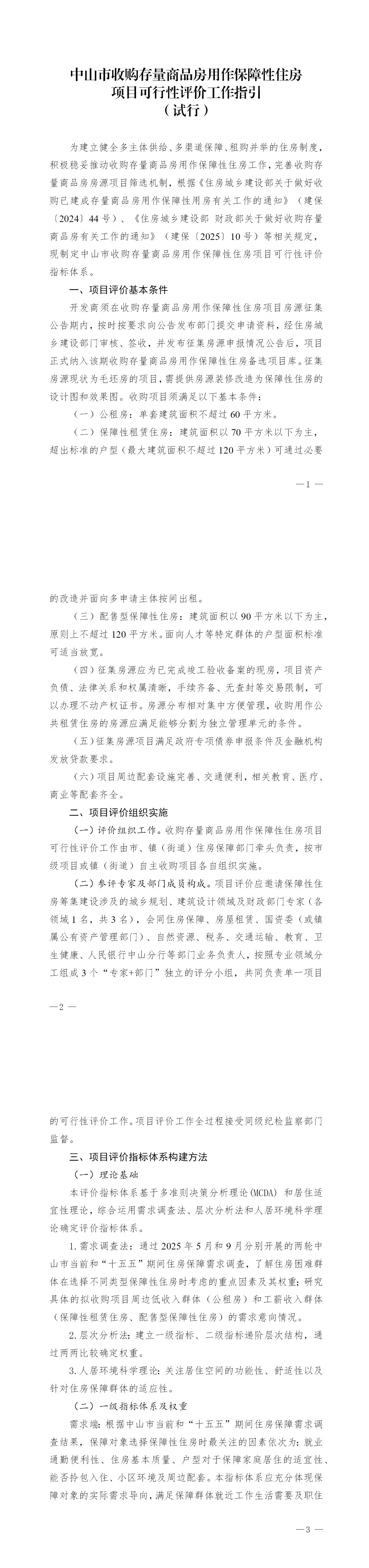 为建立健全多主体供给、多渠道保障、租购并举的住房制度,积极稳妥推动收购存量商品房用作保障性住房工作,完善收购存量商品房房源项目筛选机制,根据《住房城乡建设部关于做好收购已建成存量商品房用作保障性用房有关工作的通知》(建保〔2024〕44号)、《住房城乡建设部 财政部关于做好收购存量商品房有关工作的通知》(建保〔2025〕10号)等相关规定,现制定中山市收购存量商品房用作保障性住房项目可行性评价指标体系。