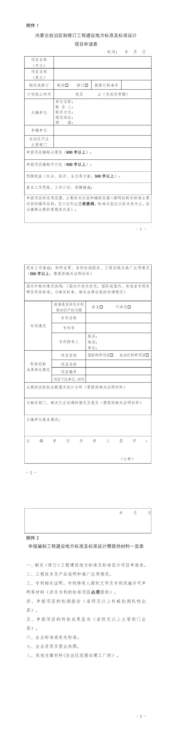 一、制定(修订)工程建设地方标准及标准设计项目申请表。