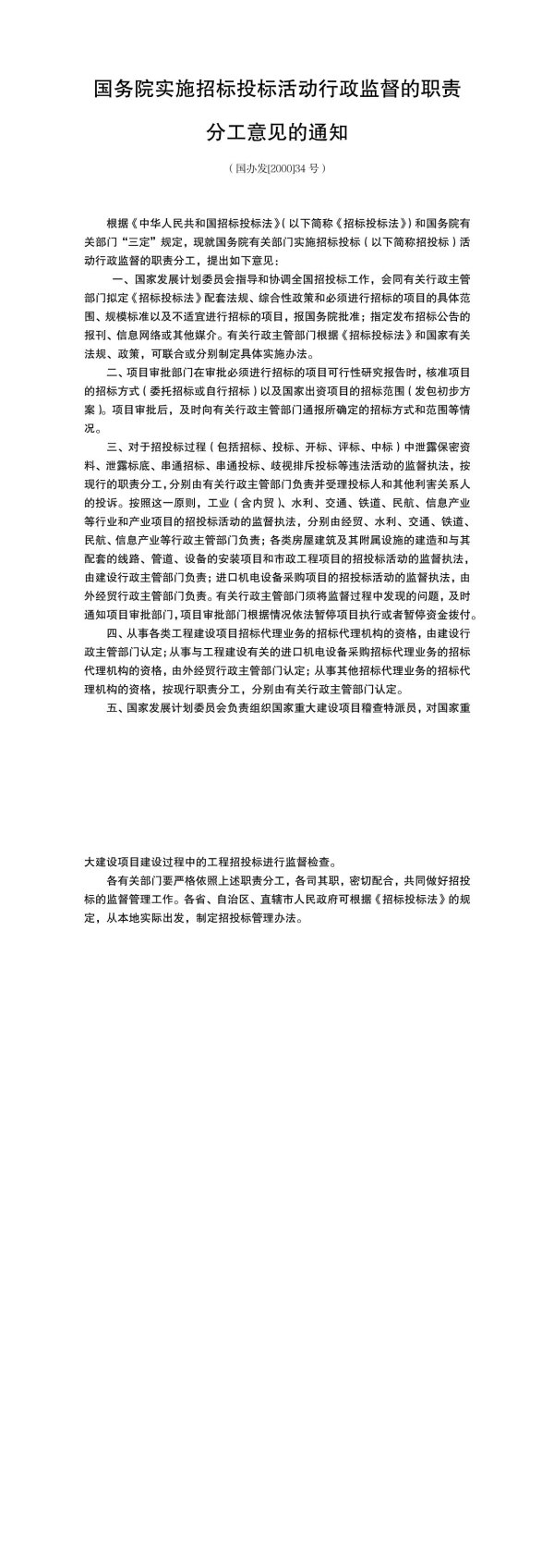 国务院实施招标投标活动行政监督的职责分工意见的通知(国办发[2000]34号)根据《中华人民共和国招标投标法》(以下简称《招标投标法》)和国务院有关部门“三定”规定,现就国务院有关部门实施招标投标(以下简称招投标)活动行政监督的职责分工,提出如下意见:一、国家发展计划委员会指导和协调全国招投标工作,会同有关行政主管部门拟定《招标投标法》配套法规、综合性政策和必须进行招标的项目的具体范围、规模标准以及不适宜进行招标的项目,报国务院批准;指定发布招标公告的报刊、信息网络或其他媒介。有关行政主管部门根据《招标投标法》和国家有关法规、政策,可联合或分别制定具体实施办法。二、项目审批部门在审批必须进行招标的项目可行性研究报告时,核准项目的招标方式(委托招标或自行招标)以及国家出资项目的招标范围(发包初步方案)。项目审批后,及时向有关行政主管部门通报所确定的招标方式和范围等情况。三、对于招投标过程(包括招标、投标、开标、评标、中标)中泄露保密资料、泄露标底、串通招标、串通投标、歧视排斥投标等违法活动的监督执法,按现行的职责分工,分别由有关行政主管部门负责并受理投标人和其他利害关系人的投诉。按照这一原则,工业(含内贸)、水利、交通、铁道、民航、信息产业等行业和产业项目的招投标活动的监督执法,分别由经贸、水利、交通、铁道、民航、信息产业等行政主管部门负责;各类房屋建筑及其附属设施的建造和与其配套的线路、管道、设备的安装项目和市政工程项目的招投标活动的监督执法,由建设行政主管部门负责;进口机电设备采购项目的招投标活动的监督执法,由外经贸行政主管部门负责。有关行政主管部门须将监督过程中发现的问题,及时通知项目审批部门,项目审批部门根据情况依法暂停项目执行或者暂停资金拨付。四、从事各类工程建设项目招标代理业务的招标代理机构的资格,由建设行政主管部门认定:从事与工程建设有关的进口机电设备采购招标代理业务的招标代理机构的资格,由外经贸行政主管部门认定;从事其他招标代理业务的招标代理机构的资格,按现行职责分工,分别由有关行政主管部门认定。五、国家发展计划委员会负责组织国家重大建设项目稽查特派员,对国家重