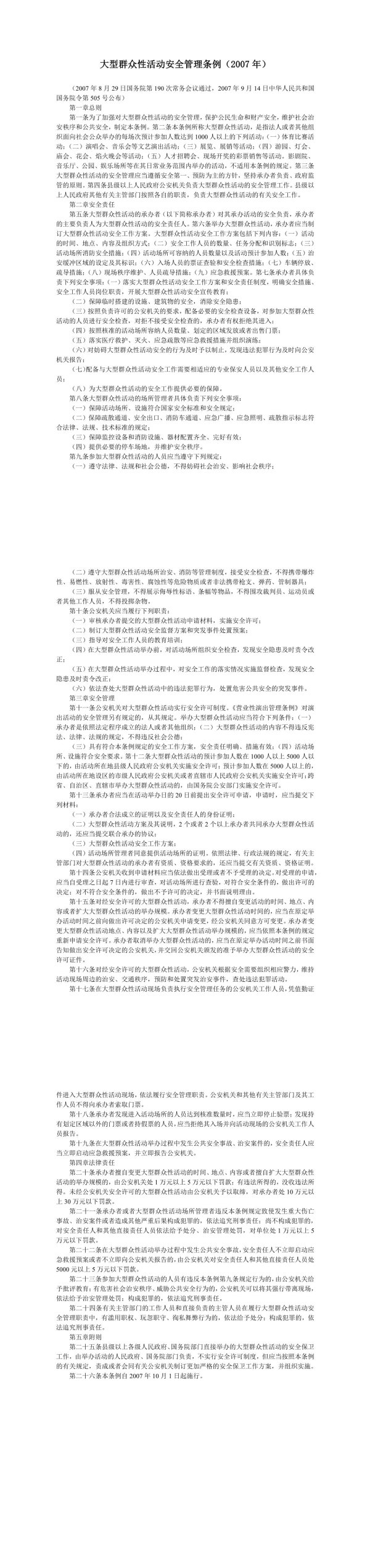 大型群众性活动安全管理条例(2007年)(2007年8月29日国务院第190次常务会议通过,2007年9月14日中华人民共和国国务院令第505号公布)第一章总则第一条为了加强对大型群众性活动的安全管理,保护公民生命和财产安全,维护社会治安秩序和公共安全,制定本条例。第二条本条例所称大型群众性活动,是指法人或者其他组织面向社会公众举办的每场次预计参加人数达到1000人以上的下列活动:(一)体育比赛活动:(二)演唱会、音乐会等文艺演出活动:(三)展览、展销等活动:(四)游园、灯会、庙会、花会、焰晚会等活动;(五)人才招聘会、现场开奖的彩票销售等活动。影剧院、音乐厅、公园、娱乐场所等在其日常业务范围内举办的活动,不适用本条例的规定。第三条大型群众性活动的安全管理应当遵循安全第一、预防为主的方针,坚持承办者负责、政府监管的原则。第四条县级以上人民政府公安机关负责大型群众性活动的安全管理工作。县级以上人民政府其他有关主管部门按照各自的职责,负责大型群众性活动的有关安全工作第二章安全责任第五条大型群众性活动的承办者(以下简称承办者)对其承办活动的安全负责,承办者的主要负责人为大型群众性活动的安全责任人。第六条举办大型群众性活动,承办者应当制订大型群众性活动安全工作方案。大型群众性活动安全工作方案包括下列内容:(一)活动的时间、地点、内容及组织方式;(二)安全工作人员的数量、任务分配和识别标志;(三)活动场所消防安全措施;(四)活动场所可容纳的人员数量以及活动预计参加人数;(五)治安缓冲区域的设定及其标识:(六)入场人员的票证查验和安全检查措施:(七)车辆停放、疏导措施:(八)现场秩序维护、人员疏导措施:(九)应急救援预案。第七条承办者具体负责下列安全事项:(一)落实大型群众性活动安全工作方案和安全责任制度,明确安全措施、安全工作人员岗位职责,开展大型群众性活动安全宣传教育;(二)保障临时搭建的设施、建筑物的安全,消除安全隐患;(三)按照负责许可的公安机关的要求,配备必要的安全检查设备,对参加大型群众性活动的人员进行安全检查,对拒不接受安全检查的,承办者有权拒绝其进入;(四)按照核准的活动场所容纳人员数量、划定的区域发放或者出售门票;(五)落实医疗救护、灭火、应急疏散等应急救援措施并组织演练;(六)对妨碍大型群众性活动安全的行为及时予以制止,发现违法犯罪行为及时向公安机关报告;(
