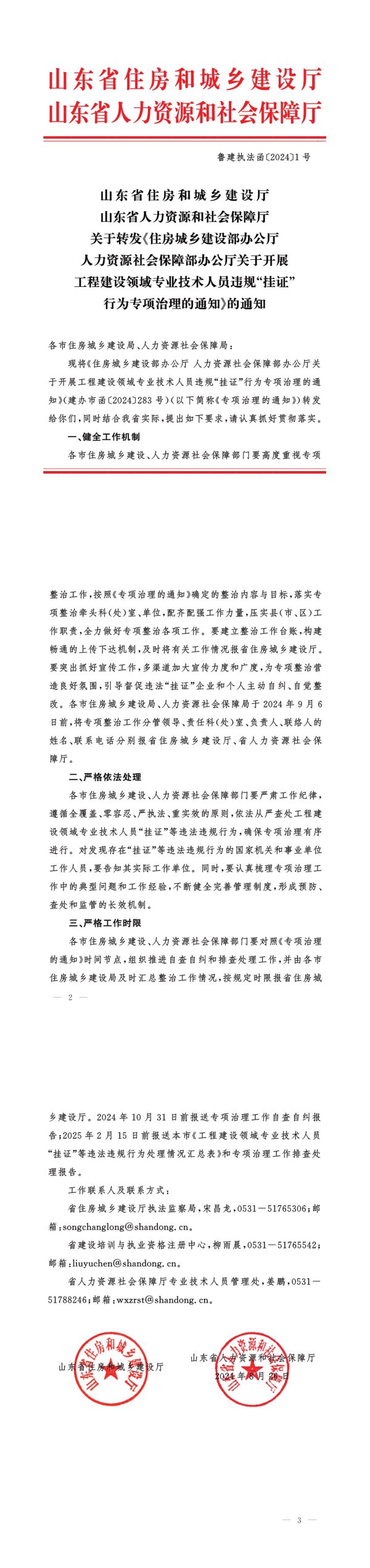 山东省住房和城乡建设厅山东省人力资源和社会保障厅鲁建执法函[2024]1号山东省住房和城乡建设厅山东省人力资源和社会保障厅关于转发《住房城乡建设部办公厅人力资源社会保障部办公厅关於开展工程建设领域专业技术人员违规“挂证”行为专项治理的通知》的通知各市住房城乡建设局、人力资源社会保障局:现将《住房城乡建设部办公厅人力资源社会保障部办公厅关于开展工程建设领域专业技术人员违规“挂证”行为专项治理的通知》(建办市函[2024】283号)(以下简称《专项治理的通知》)转发给你们,同时结合我省实际,提出如下要求,请认真抓好贯彻落实。一、健全工作机制各市住房城乡建设、人力资源社会保障部门要高度重视专项