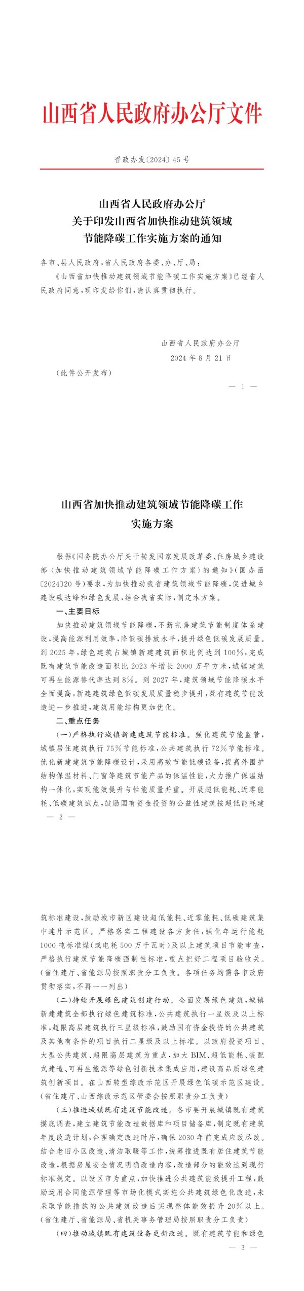 山西省人民政府办公厅文件晋政办发[2024】45号山西省人民政府办公厅关于印发山西省加快推动建筑领域节能降碳工作实施方案的通知各市、县人民政府,省人民政府各委、办、厅、局:《山西省加快推动建筑领域节能降碳工作实施方案》已经省人民政府同意,现印发给你们,请认真贯彻执行。山西省人民政府办公厅2024年8月21日(此件公开发布)—1