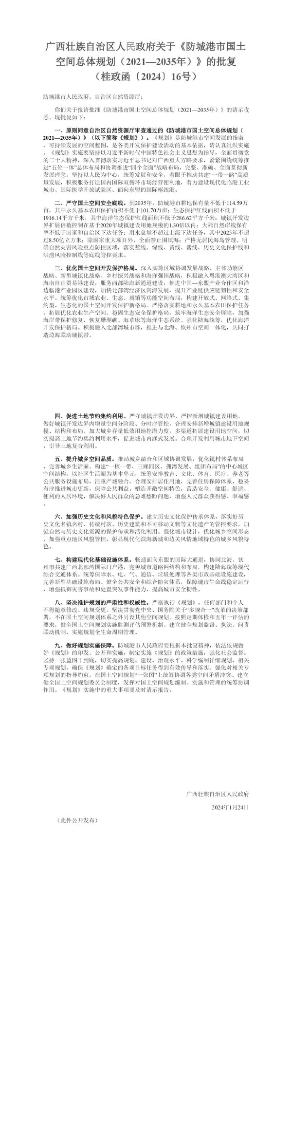 广西壮族自治区人民政府关于《防城港市国土空间总体规划(2021—2035年)》的批复(桂政函〔2024〕16号)