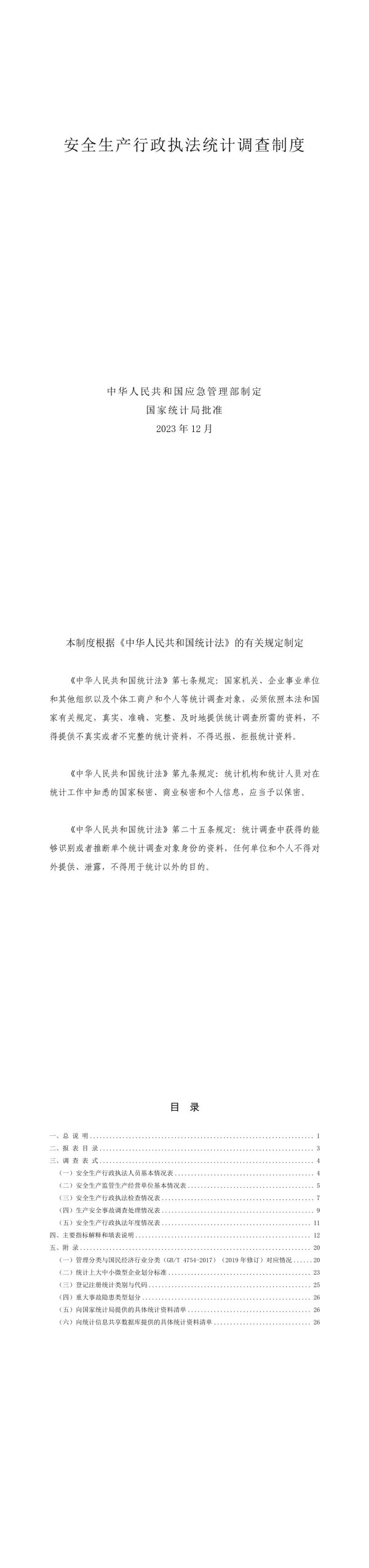 安全生产行政执法统计调查制度中华人民共和国应急管理部制定国家统计局批准2023年12月