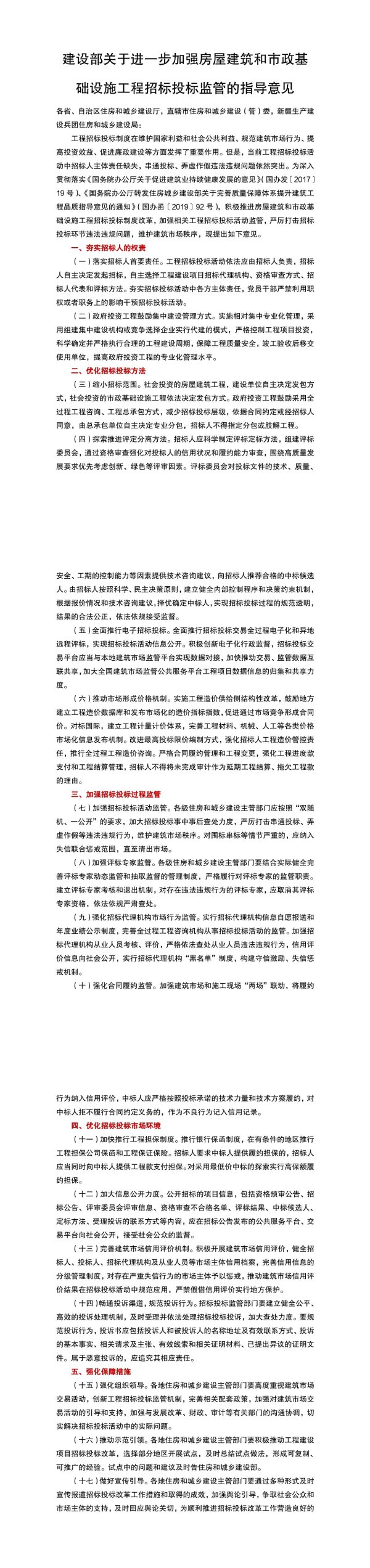 建设部关于进一步加强房屋建筑和市政基础设施工程招标投标监管的指导意见各省、自治区住房和城乡建设厅,直辖市住房和城乡建设(管)委,新疆生产建设兵团住房和城乡建设局:工程招标投标制度在维护国家利益和社会公共利益、规范建筑市场为、提高投资效益、促进廉政建设等方面发挥了重要作用。但是,当前工程招标投标活动中招标人主体责任缺失,串通投标、弄虚作假违法违规问题依然突出。为深入贯彻落实《国务院办公厅关于促进建筑业持续健康发展的意见》(国办发〔201719号)、《国务院办公厅转发住房城乡建设部关于完善质量保障体系提升建筑工程品质指导意见的通知》(国办函〔2019〕92号),积极推进房屋建筑和市政基础设施工程招标投标制度改革,加强相关工程招标投标活动监管,严厉打击招标投标环节违法违规问题,维护建筑市场秩序,现提出如下意见。一、夯实招标人的权责(一)落实招标人首要责任。工程招标投标活动依法应由招标人负责,招标人自主决定发起招标,自主选择工程建设项目招标代理机构、资格审查方式、招标人代表和评标方法。夯实招标投标活动中各方主体责任,党员干部严禁利用职权或者职务上的影响干预招标投标活动。(二)政府投资工程鼓励集中建设管理方式。实施相对集中专业化管理,采用组建集中建设机构或竞争选择企业实行代建的模式,严格控制工程项目投资,科学确定并严格执行合理的工程建设周期,保障工程质量安全,竣工验收后移交使用单位,提高政府投资工程的专业化管理水平。二、优化招标投标方法(三)缩小招标范围。社会投资的房屋建筑工程,建设单位自主决定发包方式,社会投资的市政基础设施工程依法决定发包方式。政府投资工程鼓励采用全过程工程咨询。工程总承包方式,减少招标投标层级,依据合同约定或经招标人同意,由总承包单位自主决定专业分包,招标人不得指定分包或肢解工程。(四)探索推进评定分离方法。招标人应科学制定评标定标方法,组建评标委员会,通过资格审查强化对投标人的信用状况和履约能力审查,围绕高质量发展要求优先考虑创新、绿色等评审因素。评标委员会对投标文件的技术、质量、