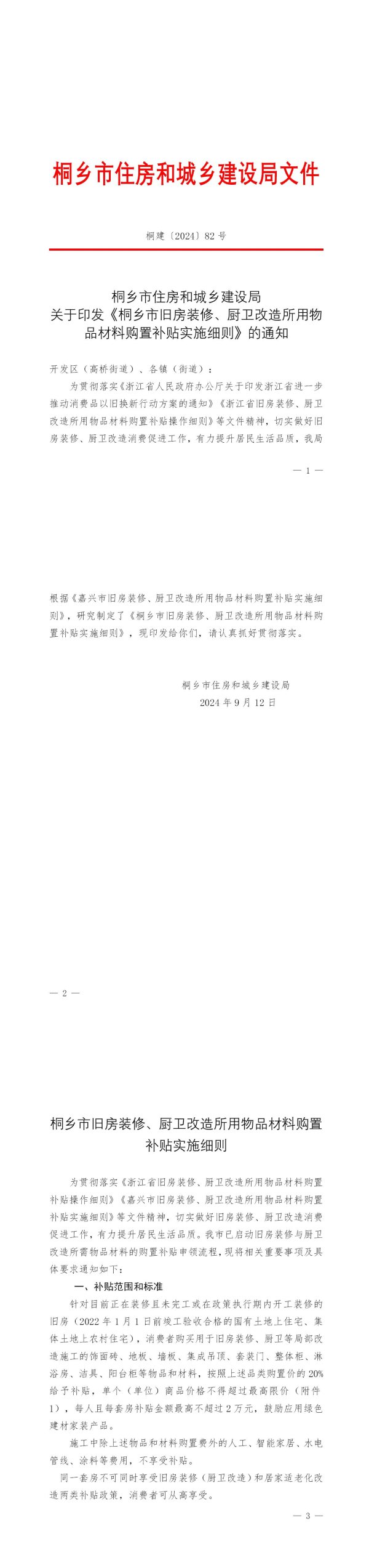 为贯彻落实《浙江省人民政府办公厅关于印发浙江省进一步推动消费品以旧换新行动方案的通知》《浙江省旧房装修、厨卫改造所用物品材料购置补贴操作细则》等文件精神,切实做好旧房装修、厨卫改造消费促进工作,有力提升居民生活品质,我局根据《嘉兴市旧房装修、厨卫改造所用物品材料购置补贴实施细则》,研究制定了《桐乡市旧房装修、厨卫改造所用物品材料购置补贴实施细则》,现印发给你们,请认真抓好贯彻落实。