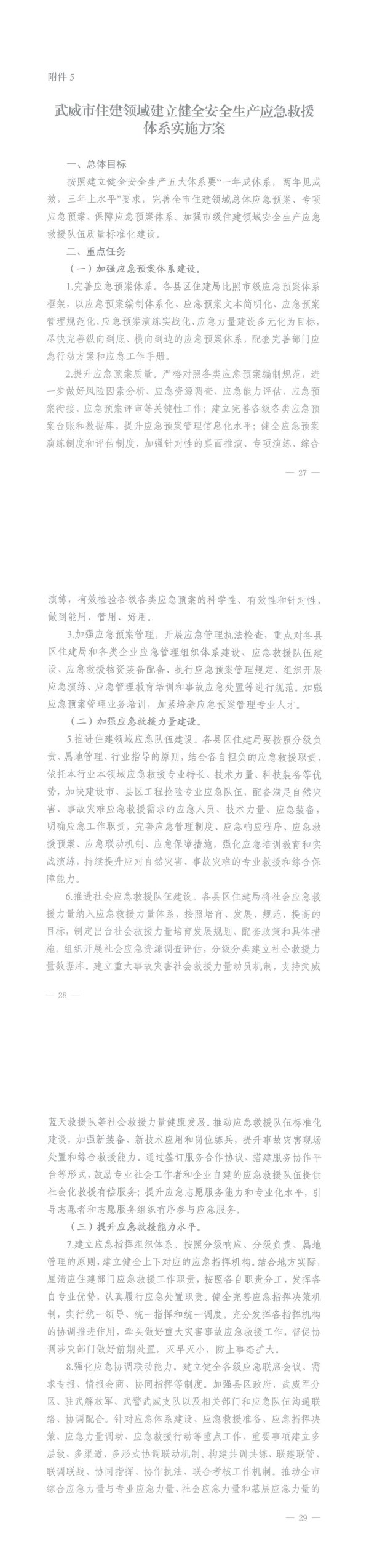 附件5武威市住建领域建立健全安全生产应急救援体系实施方案一、总体目标按照建立健全安全生产五大体系要“一年成体系,两年见成效,三年上水平”要求,完善全市住建领域总体应急预案、专项应急预案、保障应急预案体系。加强市级住建领域安全生产应急救援队伍质量标准化建设。二、重点任务(一)加强应急预案体系建设。1.完善应急预案体系。各县区住建局比照市级应急预案体系框架,以应急预案编制体系化、应急预案文本简明化、应急预案管理规范化、应急预案演练实战化、应急力量建设多元化为目标,尽快完善纵向到底、横向到边的应急预案体系,配套完善部门应急行动方案和应急工作手册。2.提升应急预案质量。严格对照各类应急预案编制规范,进一步做好风险因素分析、应急资源调查、应急能力评估、应急预案衔接、应急预案评审等关键性工作;建立完善各级各类应急预案台账和数据库,提升应急预案管理信息化水平;健全应急预案演练制度和评估制度,加强针对性的桌面推演、专项演练、综合-27—