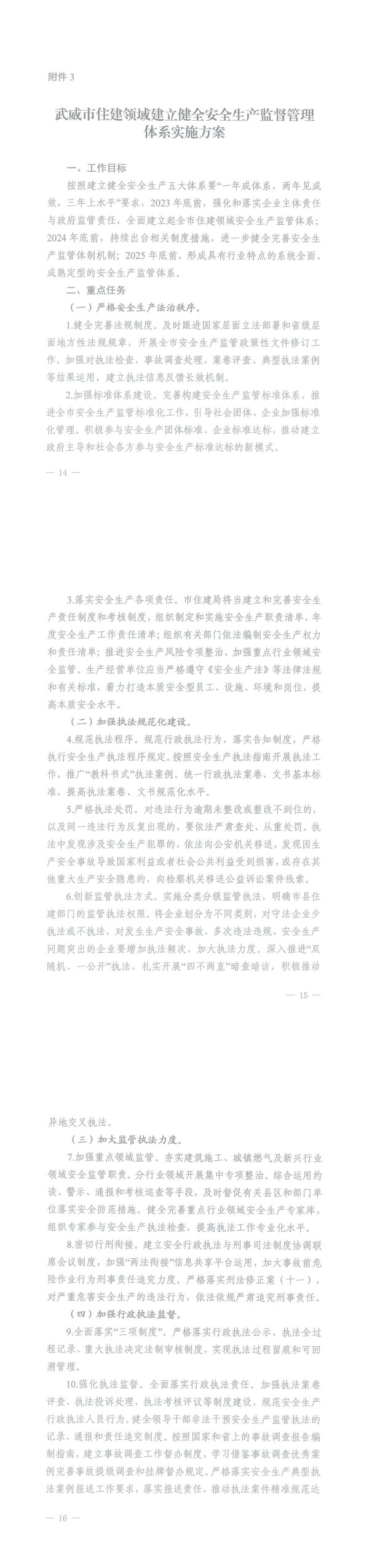 附件3武威市住建领域建立健全安全生产监督管理体系实施方案一、工作目标按照建立健全安全生产五大体系要“一年成体系,两年见成效,三年上水平”要求,2023年底前,强化和落实企业主体责任与政府监管责任,全面建立起全市住建领域安全生产监管体系;2024年底前,持续出台相关制度措施,进一步健全完善安全生产监管体制机制;2025年底前,形成具有行业特点的系统全面、成熟定型的安全生产监管体系。二、重点任务(一)严格安全生产法治秩序。1.健全完善法规制度。及时跟进国家层面立法部署和省级层面地方性法规规章,开展全市安全生产监管政策性文件修订工作。加强对执法检查、事故调查处理、案卷评查、典型执法案例等结果运用,建立执法信息反馈长效机制。2.加强标准体系建设。完善构建安全生产监管标准体系,推进全市安全生产监管标准化工作,引导社会团体、企业加强标准化管理。积极参与安全生产团体标准、企业标准达标,推动建立政府主导和社会各方参与安全生产标准达标的新模式。—14—