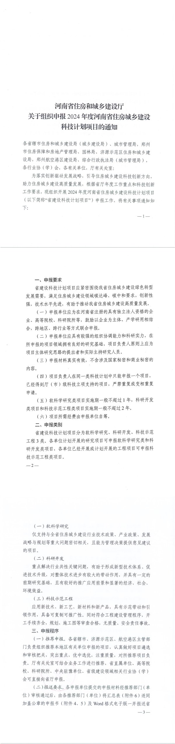 河南省住房和城乡建设厅关于组织申报2024年度河南省住房城乡建设科技计划项目的通知各省辖市住房和城乡建设局(城乡建设局)、城市管理局,郑州市住房保障和房地产管理局、园林局,济源示范区住房和城乡建设局,郑州航空港区建设局、综合行政执法局(城市管理局),各行业协(学)会,各有关单位,厅有关处室:为落实创新驱动发展战略,引导住房城乡建设科技创新方向,助力住房城乡建设高质量发展,根据省厅年度工作重点和科技创新工作要求,现组织开展2024年度河南省住房城乡建设科技计划项目(以下简称“省建设科技计划项目”)申报工作,将有关事项通知如下:-1