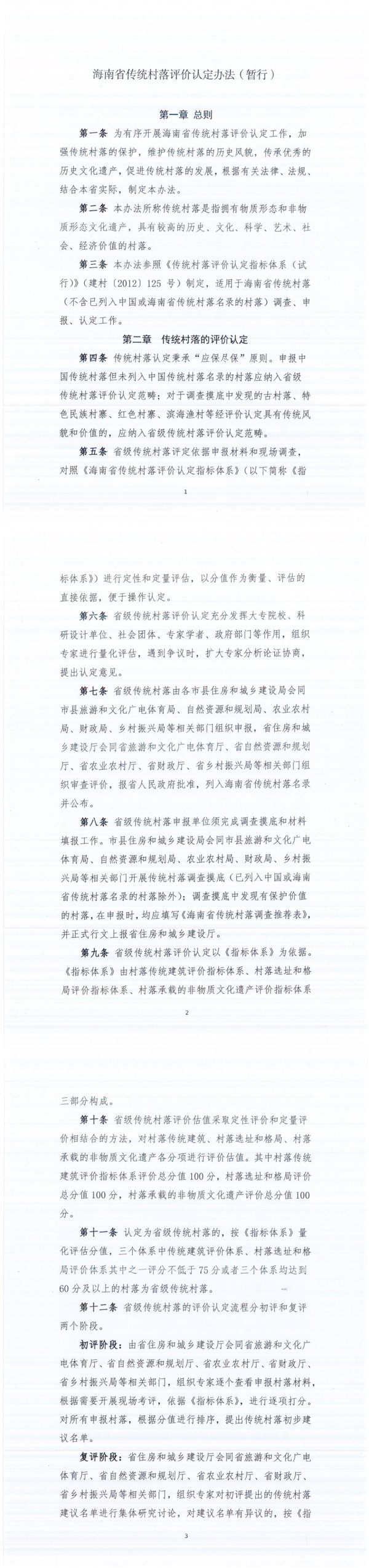海南省传统村落评价认定办法(暂行)第一章总则第一条为有序开展海南省传统村落评价认定工作,加强传统村落的保护,维护传统村落的历史风貌,传承优秀的历史文化遗产,促进传统村落的发展,根据有关法律、法规、结合本省实际,制定本办法。第二条本办法所称传统村落是指拥有物质形态和非物质形态文化遗产,具有较高的历史、文化、科学、艺术、社会、经济价值的村落。第三条本办法参照《传统村落评价认定指标体系(试行)》(建村〔2012)125号)制定,适用于海南省传统村落(不含已列入中国或海南省传统村落名录的村落)调查、申报、认定工作。第二章传统村落的评价认定第四条传统村落认定秉承“应保尽保”原则。申报中国传统村落但未列入中国传统村落名录的村落应纳入省级传统村落评价认定范畴;对于调查摸底中发现的古村落、特色民族村寨、红色村寨、滨海渔村等经评价认定具有传统风貌和价值的,应纳入省级传统村落评价认定范畴。第五条省级传统村落评定依据申报材料和现场调查,对照《海南省传统村落评价认定指标体系》(以下简称《指1
