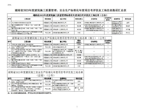 湖南省2023年度建筑施工质量管理、安全生产标准化年度项目考评优良工地信息勘误汇总表