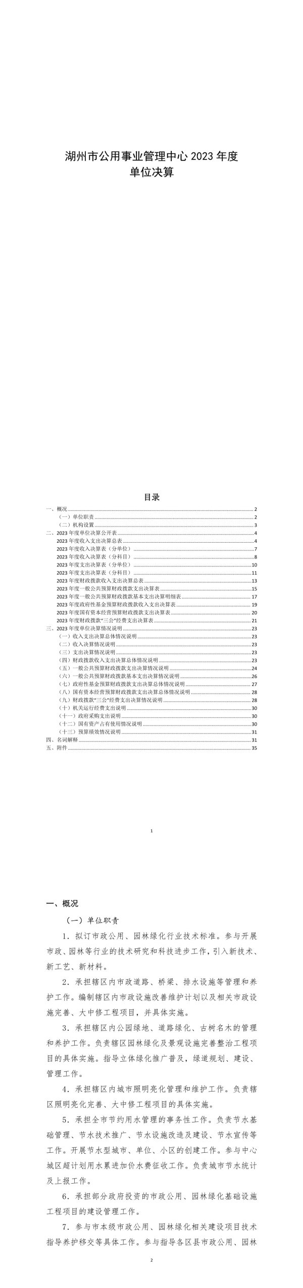 目录一、概况……….2(一)单位职责....2(二)机构设置..….322023年度单位决算公开表2023年度收入出决算总表…4…2023年度收入决算表(分单位)2023年度收入决算表(分科)8…72023年度出决算表(分单位)……2023年度出决算表(分科)……102023年度财政拨款收入出决算总表…2023年度般公共预算财政拨款出决算表.13……….152023年度般公共预算财政拨款基本出决算明细表2023年度政府性基预算财政拨款收入出决算表.…17…192023年度国有资本经营预算财政拨款出决算表……202023年度财政拨款“三公”经费出决算表….三、2023年度单位决算情况说明…2321(一)收入支出决算总体情况说明..………23(二)收入决算情况说明,……23(三)出决算情况说明….(四)财政拨款收出决算总体情况说明……23(五)一般公共预算财政拨款出决算情况说明.…23[…24(六)一般公共预算财政拨款基本出决算情况说明….26(七)政府性基金预算财政拨款支出决算总体情况说明(九)财政拨款“三公”经费出决算情况说明……28…27()国有资本经营预算财政拨款出决算总体情况说明…….28(十)机关运行经费支出说明.·……30(十一)政府采购支出说明,…………………….30()国有资产占有使情况说明.(三)预算绩效情况说明……30四、名词解释….…31五、附件.…31…351