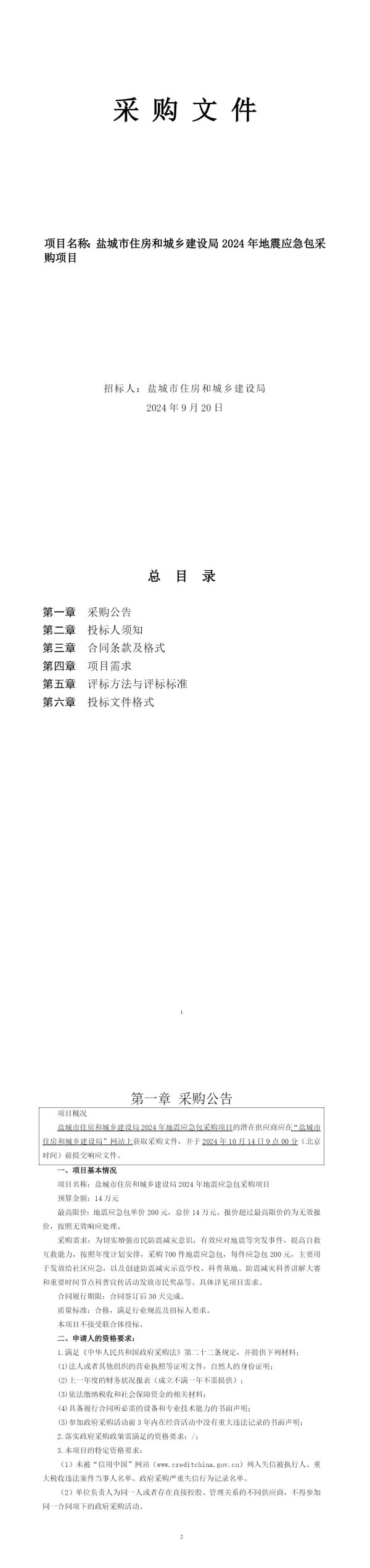 盐城市住房和城乡建设局2024年地震应急包采购项目的潜在供应商应在“盐城市住房和城乡建设局”网站上获取采购文件,并于2024年10月14日9点00分(北京时间)前提交响应文件。