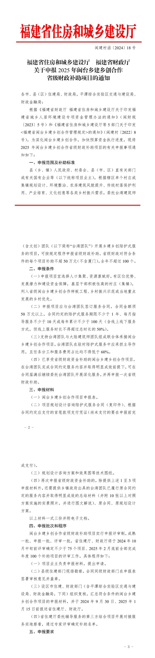 福建省住房和城乡建设厅闽建村函〔2024)18号福建省住房和城乡建设厅福建省财政厅关于申报2025年闽台乡建乡创合作省级财政补助项目的通知各市、县(区)住建局、财政局,平潭综合实验区交通与建设局、财政金融局:根据《福建省财政厅福建省住房和城乡建设厅关于印发福建省城乡人居环境建设专项资金管理办法的通知》(闽财规〔2023〕5号)和《福建省住房和城乡建设厅等5部门关于印发<福建省闽台乡建乡创合作管理规定>的通知》(闽建村〔2022)8号),为深化闽台乡建乡创合作,加快预算资金执行进度,现将2025年闽台乡建乡创合作省级财政补助项目的有关申报事项通知如下:一、申报范围及补助标准县(乡、镇)人民政府、村委会、县(市、区)直有关部门或有关国有企业等(以下统称项目业主),根据辖区单个村庄或集镇规划设计、环境整治、农房建筑风貌提升、传统村落保护利用、产业培育、文化创意等各类乡村振兴需求,委托台湾建筑师