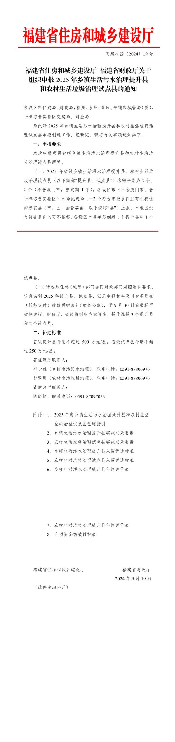 试点县。(二)请各地住建(城管)部门会同财政部门对照附件要求,认真谋划2025年提升县、试点县,汇总申报材料及《专项资金(转移支付)绩效目标表》(加盖公章),于9月30日前报送至省住建厅、财政厅。省级将组织专家评审,择优选择3个提升县和2个试点县。二、补助标准省级提升县补助不超过500万元/县,省级试点县补助不超过250万元/县。省住建厅联系人:郑少雄(乡镇生活污水治理)、联系电话:0591-87806976曾繁勇(农村生活垃圾治理)、联系电话:0591-87806976省财政厅联系人:陈舒虹、联系电话:0591-87097053附件:1.2025年度乡镇生活污水治理提升县和农村生活垃圾治理试点县创建指引2.乡镇生活污水治理提升县实施成效要素3.农村生活垃圾治理试点县实施成效要素4.乡镇生活污水治理提升县入围评选标准5.农村生活垃圾治理试点县入围评选标准6.乡镇生活污水治理提升县年终评价表