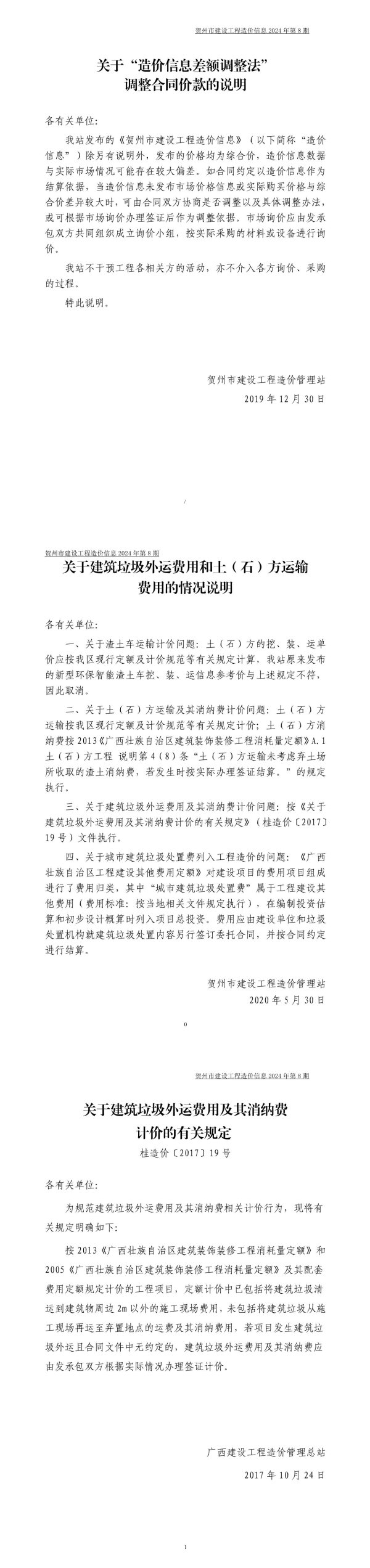 贺州市建设工程造价信息2024年第8期关于建筑垃圾外运费用和土(石)方运输费用的情况说明各有关单位:一、关于渣土车运输计价问题:土(石)方的挖、装、运单价应按我区现行定额及计价规范等有关规定计算,我站原来发布的新型环保智能渣土车挖、装、运信息参考价与上述规定不符,因此取消。二、关于土(石)方运输及其消纳费计价问题:土(石)方运输按我区现行定额及计价规范等有关规定计价;土(石)方消纳费按2013《广西壮族自治区建筑装饰装修工程消耗量定额》A.1土(石)方工程说明第4(8)条“土(石)方运输未考虑弃土场所收取的渣土消纳费,若发生时按实际办理签证结算。”的规定执行。三、关于建筑垃圾外运费用及其消纳费计价问题:按《关于建筑垃圾外运费用及其消纳费计价的有关规定》(桂造价【2017】19号)文件执行。四、关于城市建筑垃圾处置费列入工程造价的问题:《广西壮族自治区工程建设其他费用定额》对建设项目的费用项目组成进行了费用归类,其中“城市建筑垃圾处置费”属于工程建设其他费用(费用标准:按当地相关文件规定执行),在编制投资估算和初步设计概算时列入项目总投资。费用应由建设单位和垃圾处置机构就建筑垃圾处置内容另行签订委托合同,并按合同约定进行结算。贺州市建设工程造价管理站2020年5月30日0