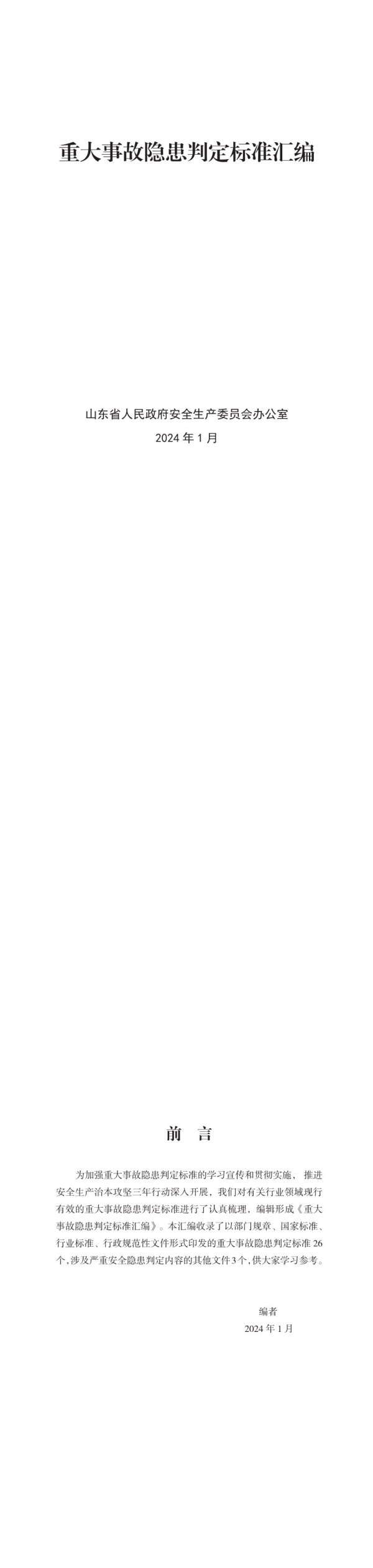 重大事故隐患判定标准汇编山东省人民政府安全生产委员会办公室2024年1月