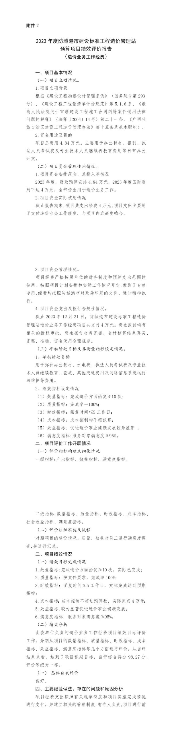 由我单位负责的造价业务工作经费项目绩效目标评价工作,分别从项目的数量指标、质量指标、时效指标、成本指标、效益指标、满意度指标等几个方面进行评价,从自评结果来看,达到了项目预期目标,自评综合得分98.27分,评价等级为一等。