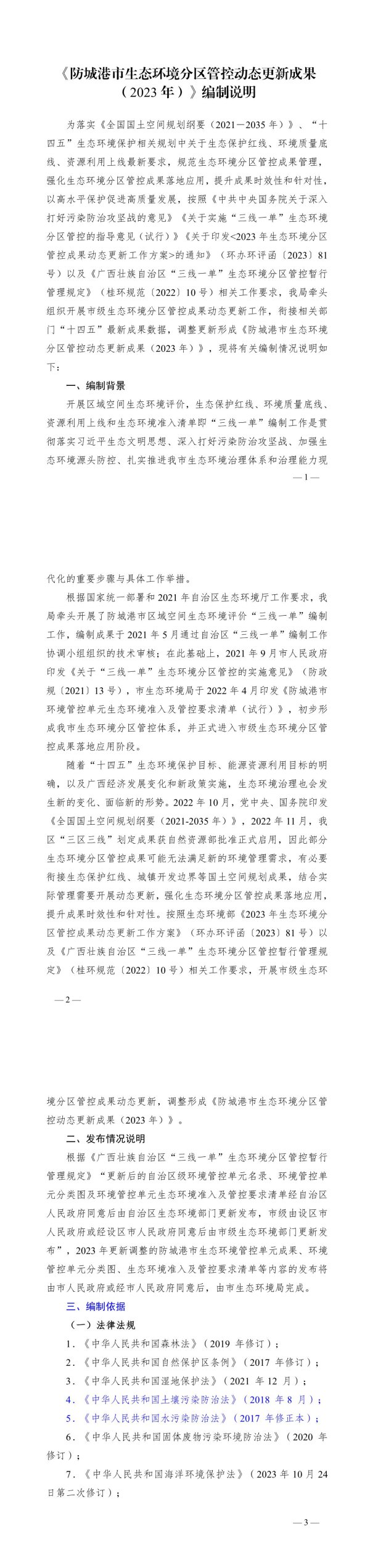 《防城港市生态环境分区管控动态更新成果(2023年)》编制说明为落实《全国国土空间规划纲要(2021一2035年)》、“十四五”生态环境保护相关规划中关于生态保护红线、环境质量底线、资源利用上线最新要求,规范生态环境分区管控成果管理,强化生态环境分区管控成果落地应用,提升成果时效性和针对性,以高水平保护促进高质量发展,按照《中共中央国务院关于深入打好污染防治攻坚战的意见》《关于实施“三线一单”生态环境分区管控的指导意见(试行)》《关于印发<2023年生态环境分区管控成果动态更新工作方案>的通知》(环办环评函〔2023)81号)以及《广西壮族自治区“三线一单”生态环境分区管控暂行管理规定》(桂环规范〔2022)10号)相关工作要求,我局牵头组织开展市级生态环境分区管控成果动态更新工作,衔接相关部门“十四五”最新成果数据,调整更新形成《防城港市生态环境分区管控动态更新成果(2023年)》,现将有关编制情况说明如下:一、编制背景开展区域空间生态环境评价,生态保护红线、环境质量底线、资源利用上线和生态环境准入清单即“三线一单”编制工作是贯彻落实习近平生态文明思想、深入打好污染防治攻坚战、加强生态环境源头防控、扎实推进我市生态环境治理体系和治理能力现—1—