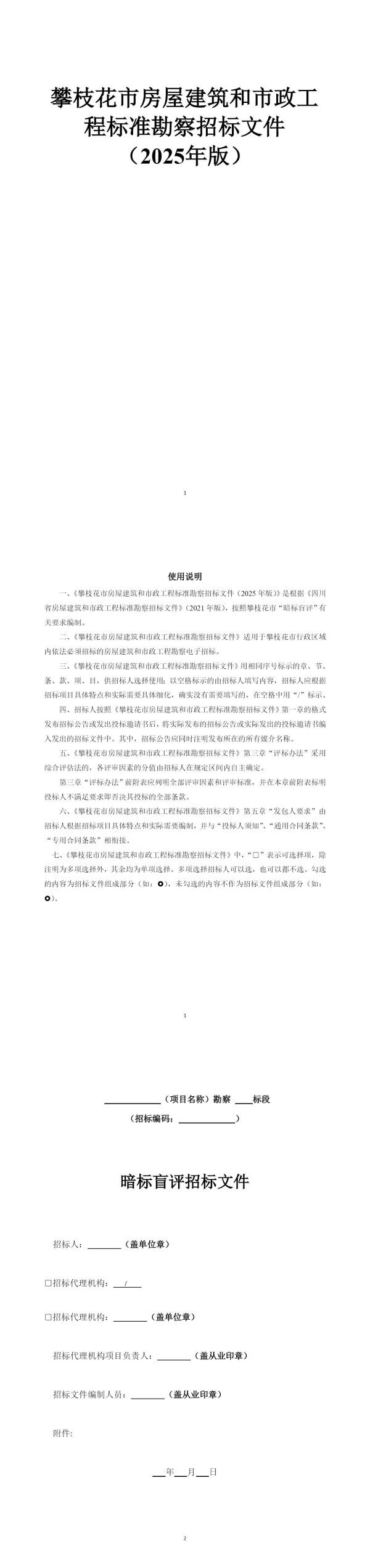 一、《攀枝花市房屋建筑和市政工程标准勘察招标文件(2025年版)》是根据《四川省房屋建筑和市政工程标准勘察招标文件》(2021年版),按照攀枝花市“暗标盲评”有关要求编制。