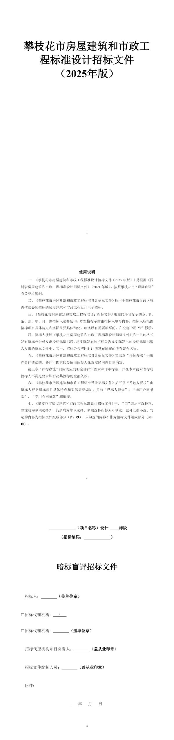 一、《攀枝花市房屋建筑和市政工程标准设计招标文件(2025年版)》是根据《四川省房屋建筑和市政工程标准设计招标文件》(2021年版),按照攀枝花市“暗标盲评”有关要求编制。