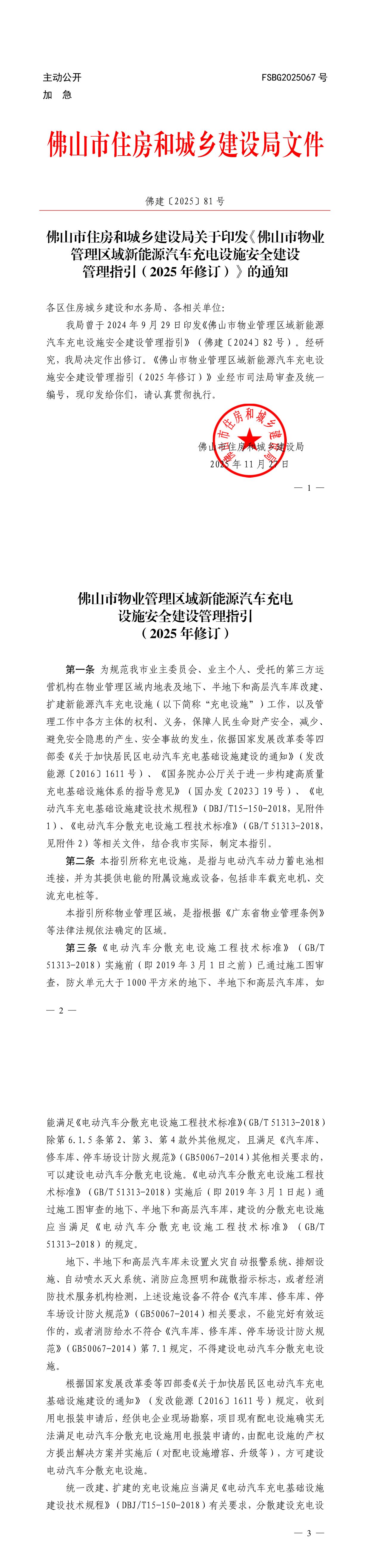主动公开FSBG2025067号加急佛山市住房和城乡建设局文件佛建[2025】81号佛山市住房和城乡建设局关于印发《佛山市物业管理区域新能源汽车充电设施安全建设管理指引(2025年修订)》的通知各区住房城乡建设和水务局、各相关单位:我局曾于2024年9月29日印发《佛山市物业管理区域新能源汽车充电设施安全建设管理指引》(佛建[2024】82号)。经研究,我局决定作出修订。《佛山市物业管理区域新能源汽车充电设施安全建设管理指引(2025年修订)》业经市司法局审查及统一编号,现印发给你们,请认真贯彻执行。房和市氧佛山市住房和城务建设局碧20佛年11月2会