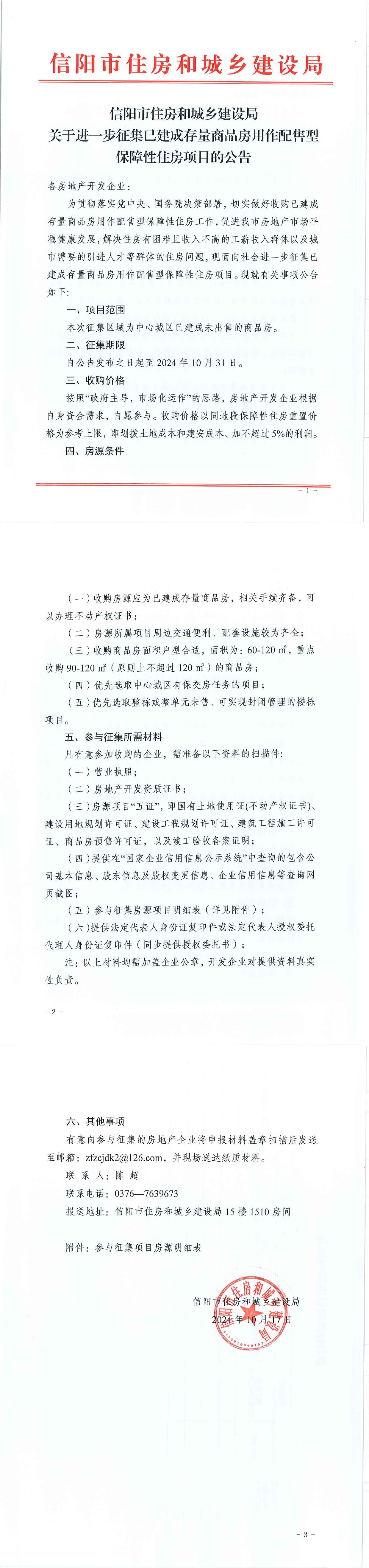 信阳市住房和城乡建设局信阳市住房和城乡建设局关于进一步征集已建成存量商品房用作配售型保障性住房项目的公告各房地产开发企业:为贯彻落实党中央、国务院决策部署,切实做好收购已建成存量商品房用作配售型保障性住房工作,促进我市房地产市场平稳健康发展,解决住房有困难且收入不高的工薪收入群体以及城市需要的引进人才等群体的住房问题,现面向社会进一步征集已建成存量商品房用作配售型保障性住房项目。现就有关事项公告如下:一、项目范围本次征集区域为中心城区已建成未出售的商品房。二、征集期限自公告发布之日起至2024年10月31日。三、收购价格按照“政府主导,市场化运作”的思路,房地产开发企业根据自身资金需求,自愿参与。收购价格以同地段保障性住房重置价格为参考上限,即划拨土地成本和建安成本、加不超过5%的利润。四、房源条件