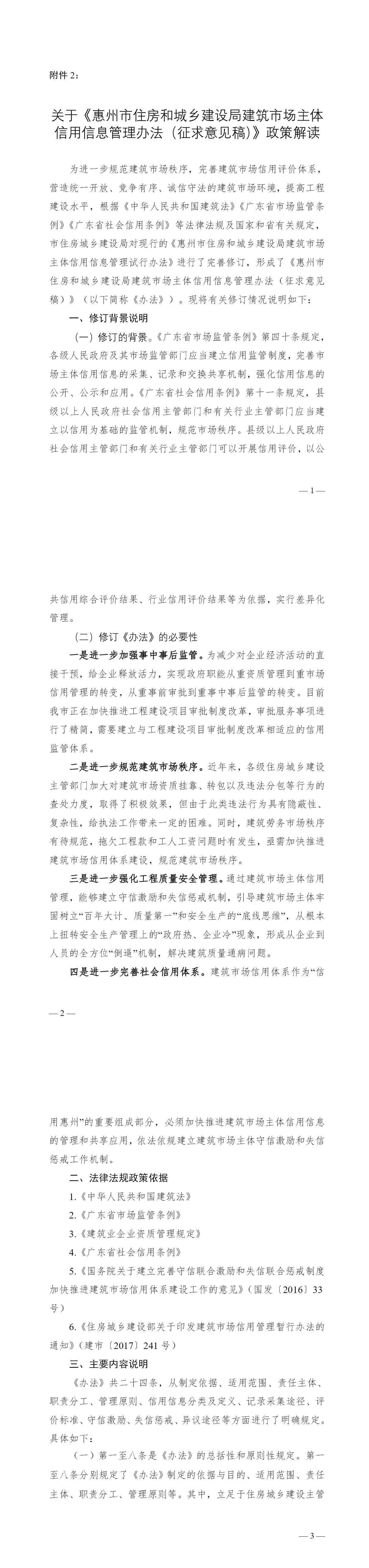 为进一步规范建筑市场秩序,完善建筑市场信用评价体系,营造统一开放、竞争有序、诚信守法的建筑市场环境,提高工程建设水平,根据《中华人民共和国建筑法》《广东省市场监管条例》《广东省社会信用条例》等法律法规及国家和省有关规定,市住房城乡建设局对现行的《惠州市住房和城乡建设局建筑市场主体信用信息管理试行办法》进行了完善修订,形成了《惠州市住房和城乡建设局建筑市场主体信用信息管理办法(征求意见稿)》(以下简称《办法》)。现将有关修订情况说明如下: