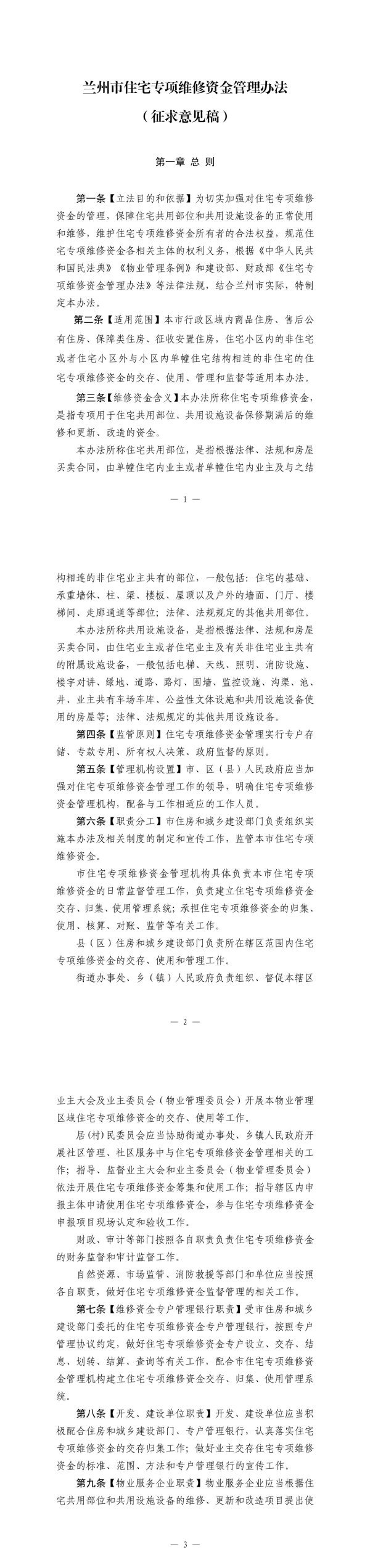 兰州市住宅专项维修资金管理办法(征求意见稿)第一章总则第一条【立法目的和依据】为切实加强对住宅专项维修资金的管理,保障住宅共用部位和共用设施设备的正常使用和维修,维护住宅专项维修资金所有者的合法权益,规范住宅专项维修资金各相关主体的权利义务,根据《中华人民共和国民法典》《物业管理条例》和建设部、财政部《住宅专项维修资金管理办法》等法律法规,结合兰州市实际,特制定本办法。第二条【适用范围】本市行政区域内商品住房、售后公有住房、保障类住房、征收安置住房,住宅小区内的非住宅或者住宅小区外与小区内单幢住宅结构相连的非住宅的住宅专项维修资金的交存、使用、管理和监督等适用本办法。第三条【维修资金含义】本办法所称住宅专项维修资金,是指专项用于住宅共用部位、共用设施设备保修期满后的维修和更新、改造的资金。本办法所称住宅共用部位,是指根据法律、法规和房屋买卖合同,由单幢住宅内业主或者单幢住宅内业主及与之结—1