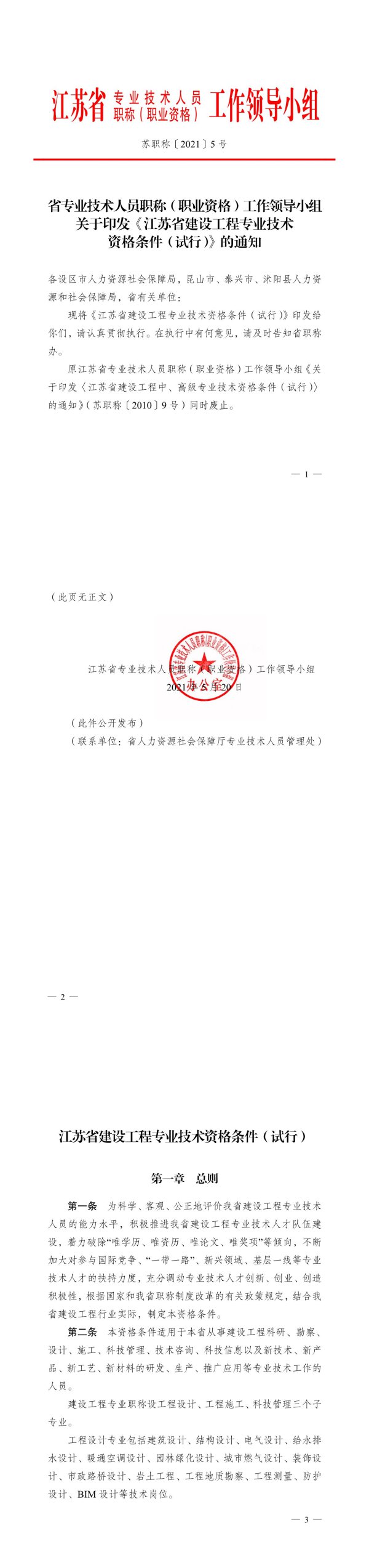江苏省专业技术人员职称(职业资格)工作领导小组苏职称[2021】5号省专业技术人员职称(职业资格)工作领导小组关于印发《江苏省建设工程专业技术资格条件(试行)》的通知各设区市人力资源社会保障局,昆山市、泰兴市、沭阳县人力资源和社会保障局,省有关单位:现将《江苏省建设工程专业技术资格条件(试行)》印发给你们,请认真贯彻执行。在执行中有何意见,请及时告知省职称办。原江苏省专业技术人员职称(职业资格)工作领导小组《关于印发<江苏省建设工程中、高级专业技术资格条件(试行))的通知》(苏职称〔2010】9号)同时废止。
