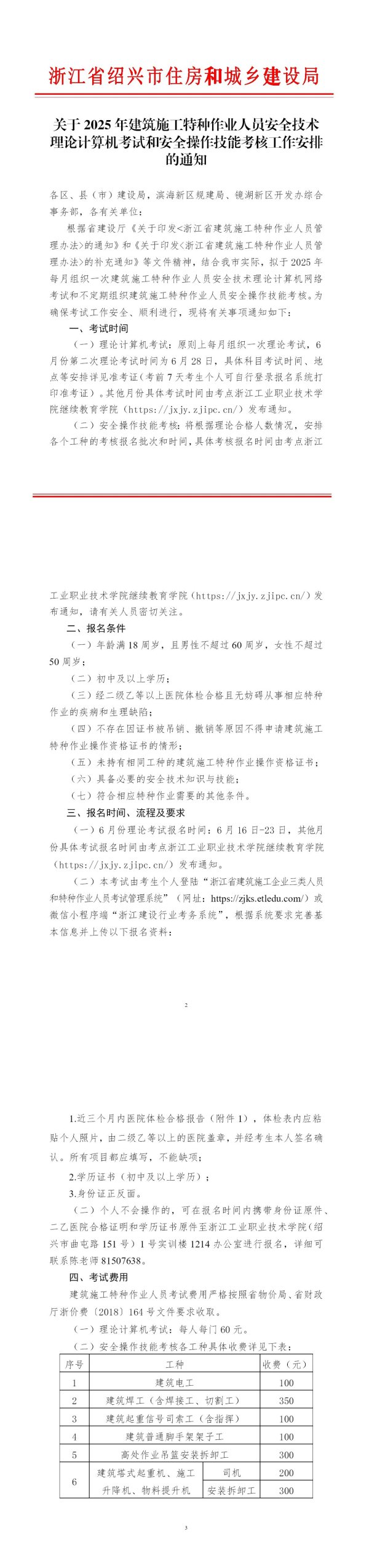 根据省建设厅《关于印发<浙江省建筑施工特种作业人员管理办法>的通知》和《关于印发<浙江省建筑施工特种作业人员管理办法>的补充通知》等文件精神,结合我市实际,拟于2025年每月组织一次建筑施工特种作业人员安全技术理论计算机网络考试和不定期组织建筑施工特种作业人员安全操作技能考核。为确保考试工作安全、顺利进行,现将有关事项通知如下: