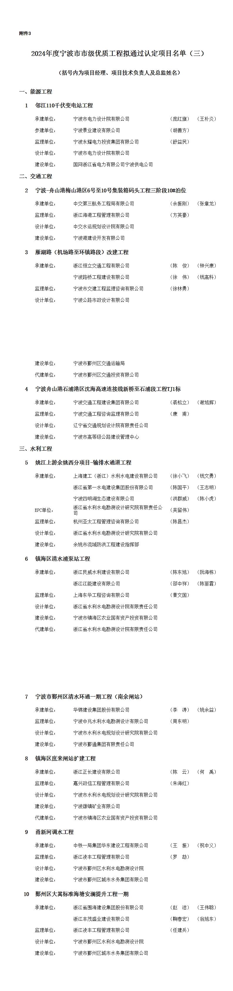 2024年度宁波市市级优质工程拟通过认定项目名单(三)