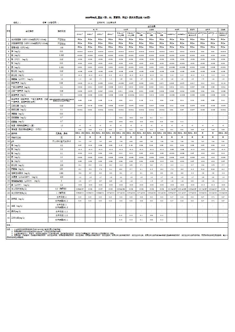 说明:1、以上指标及指标限值均执行GB5749-2022《生活饮用水卫生标准》。2、填写数据均为湖北省各地区供水企业出厂水所检测指标监测结果。3、以上信息由各市州、直管市、林区供水主管部门汇总审核上报,并对其真实性负责,本平台仅依据建设部《城市供水水质管理规定》发布。4、采用液氯、次氯酸钠、次氯酸钙消毒方式时,应测定游离氯。采用氯胺消毒方式时,应测定总氯。采用臭氧消毒方式时,应测定臭氧。采用二氧化氯消毒方式时,应测定二氧化氯。采用二氧化氯和氯混合消毒剂发生器消毒方式时,应测定二氧化氯和游离氯;两项指标均应满足限值要求,至少一项指标应满足余量要求。