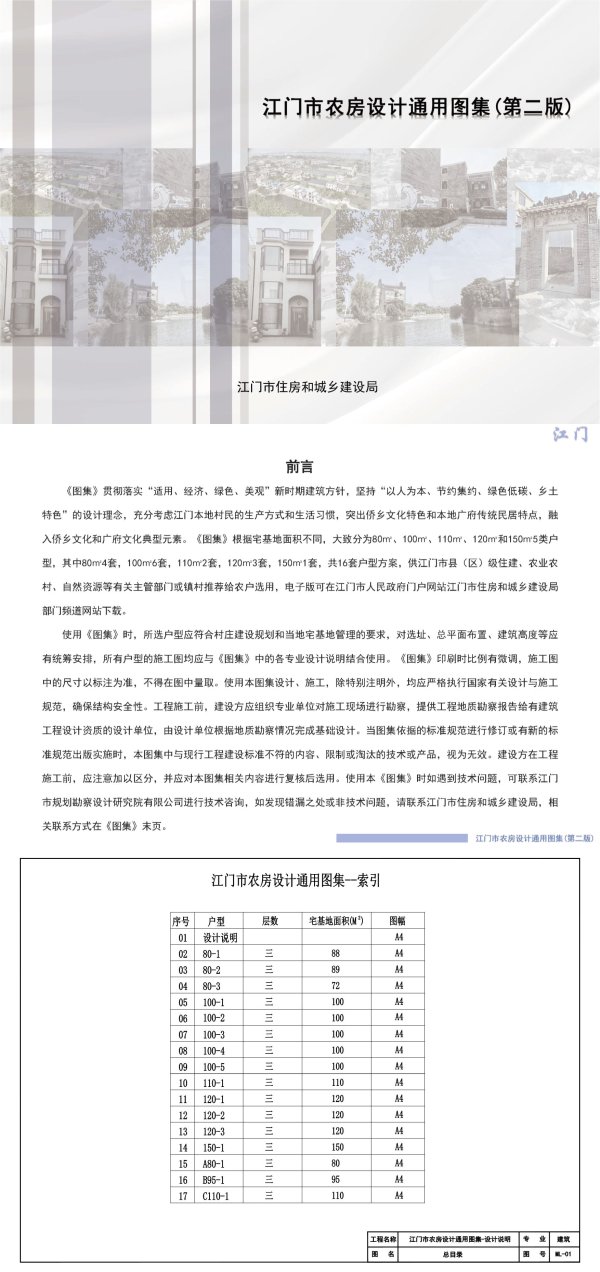 江门前言《图集》贯彻落实“适用、经济、绿色、美观”新时期建筑方针,坚持“以人为本、节约集约、绿色低碳、乡土特色”的设计理念,充分考虑江门本地村民的生产方式和生活习惯,突出侨乡文化特色和本地广府传统民居特点,融入侨乡化和府化典型元素。《图集》根据宅基地积不同,致分为80m、100m²、110m、120m和150m²5类户型,其中80m²4套,100m6套,110m²2套,120m3套,150m²1套,共16套户型方案,供江门市县(区)级住建、农业农村、自然资源等有关主管部门或镇村推荐给农户选用,电子版可在江门市人民政府门户网站江门市住房和城乡建设局部门频道网站下载。使用《图集》时,所选户型应符合村庄建设规划和当地宅基地管理的要求,对选址、总平面布置、建筑度等应有统筹安排,所有户型的施工图均应与《图集》中的各专业设计说明结合使用。《图集》印刷时比例有微调,施工图中的尺寸以标注为准,不得在图中量取。使用本图集设计、施工,除特别注明外,均应严格执行国家有关设计与施工规范,确保结构安全性。工程施工前,建设方应组织专业单位对施工现场进勘察,提供工程地质勘察报告给有建筑工程设计资质的设计单位,由设计单位根据地质勘察情况完成基础设计。当图集依据的标准规范进修订或有新的标准规范出版实施时,本图集中与现行工程建设标准不符的内容、限制或淘汰的技术或产品,视为无效。建设方在工程施工前,应注意加以区分,并应对本图集相关内容进行复核后选用。使用本《图集》时如遇到技术问题,可联系江门市规划勘察设计研究院有限公司进行技术咨询,如发现错漏之处或非技术问题,请联系江门市住房和城乡建设局,相关联系方式在《图集》末页。江门市农房设计通用图集(第二版)
